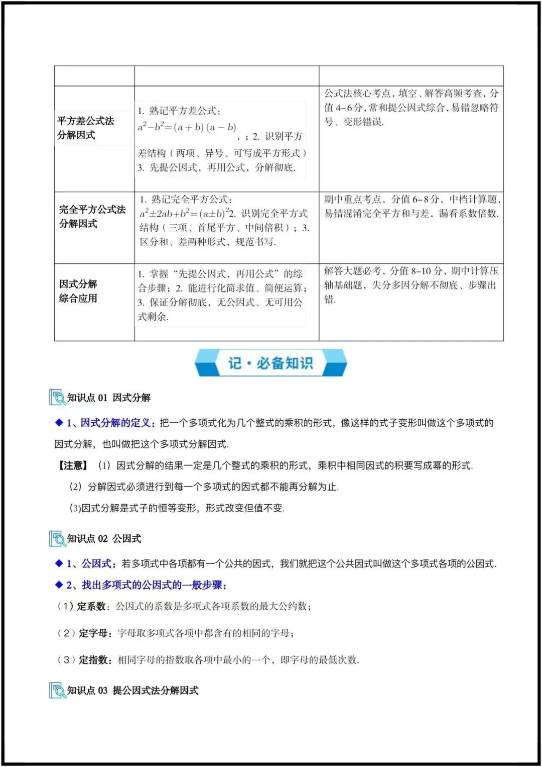 ◦ 提公因式法:必考基础,是所有因式分解题型的第一步,分值4-6分,易错点为符号处理、漏提公因式。