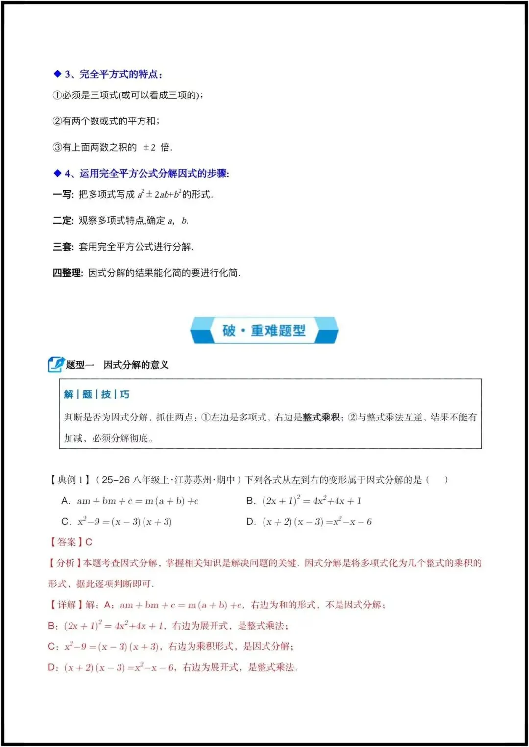 ◦ 平方差公式、完全平方公式的结构特征、适用条件与分解步骤。
