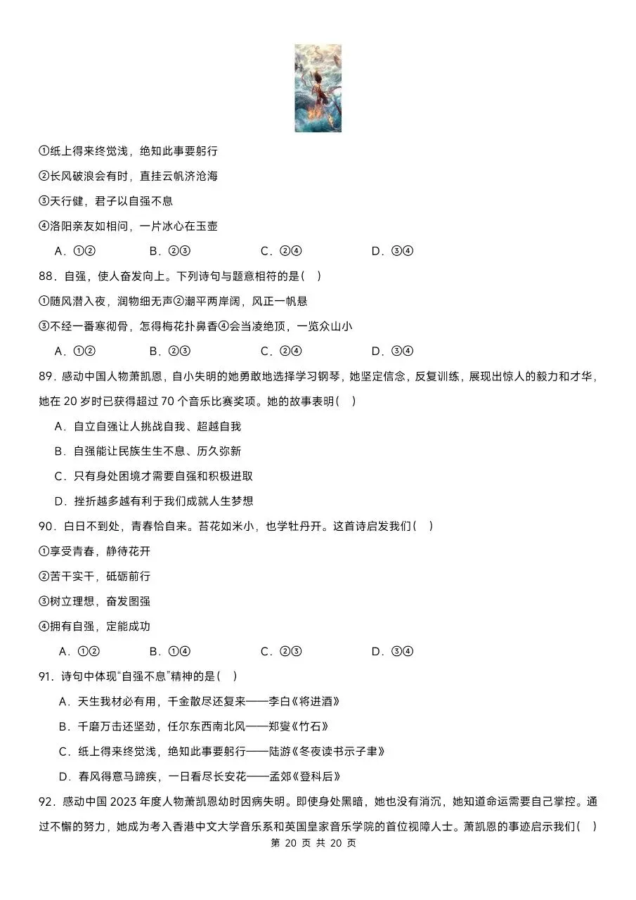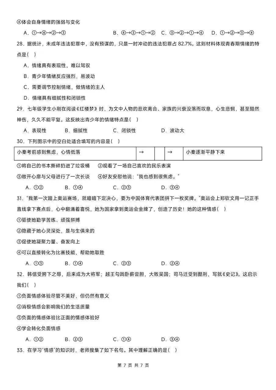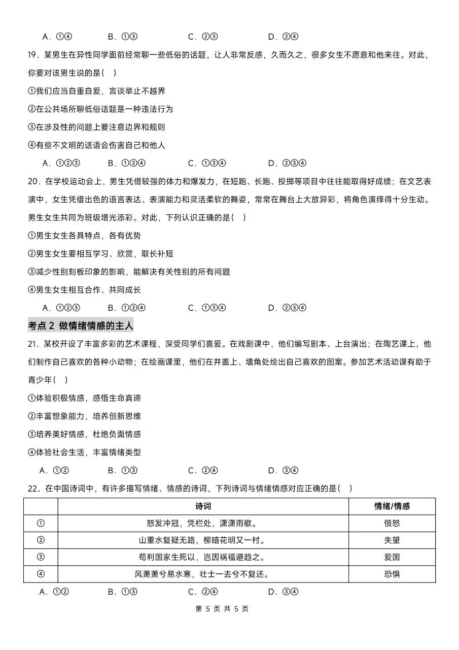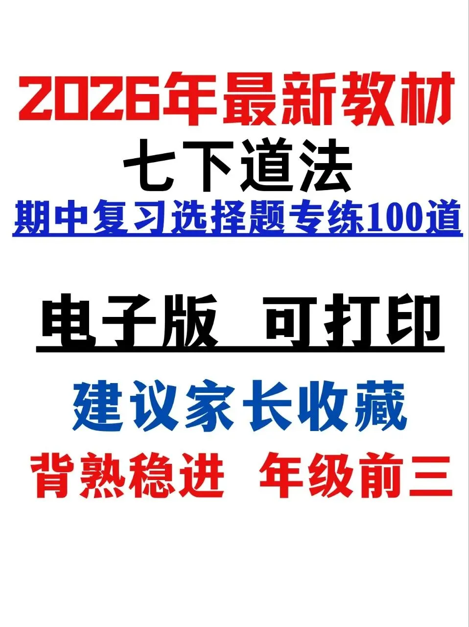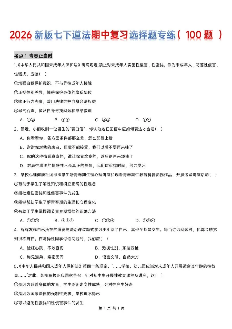 这份精选100道选择题专练,贴合2026年新版教材考点,紧扣七下道法期中核心内容,覆盖高频考点、易错题和高频陷阱题。题型全面针对性强,完全适配期中考察方向。