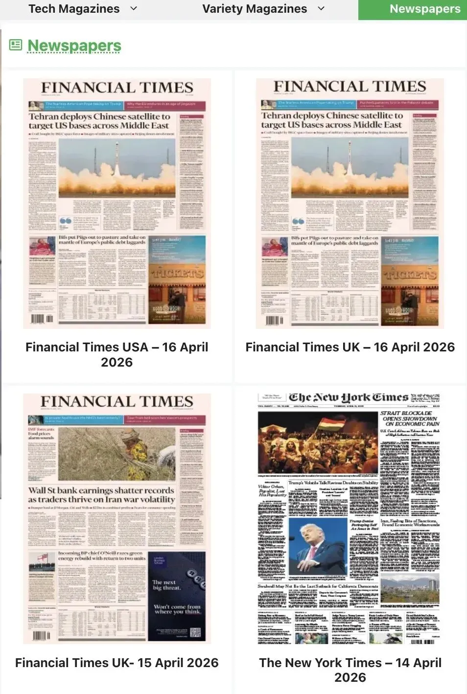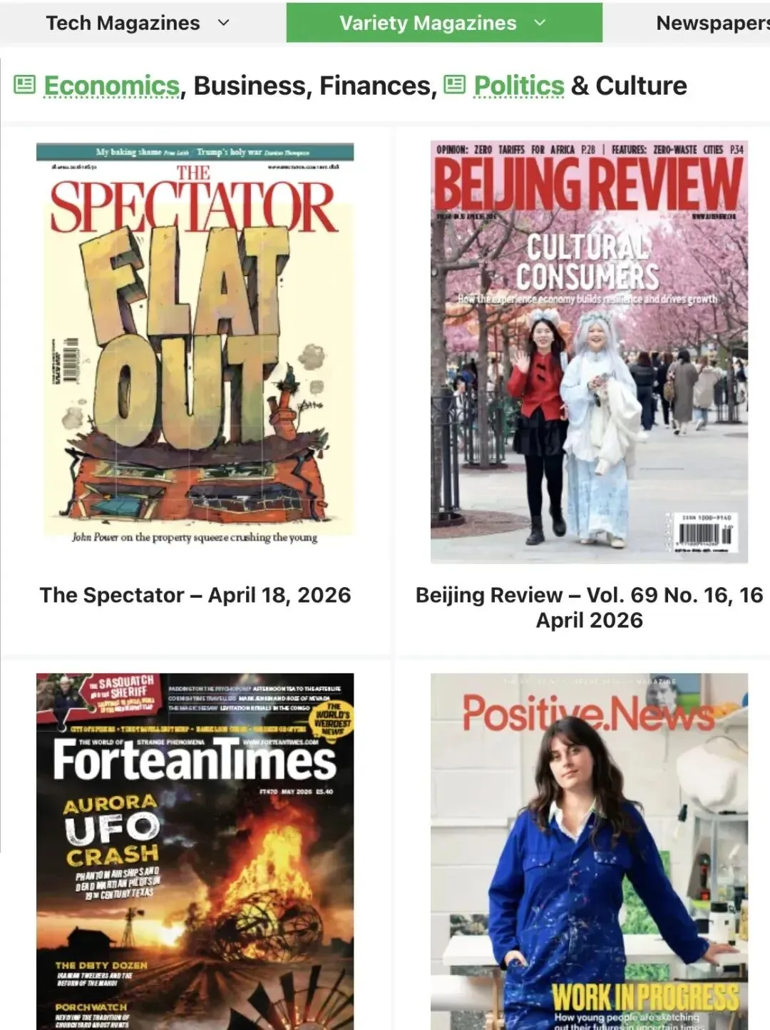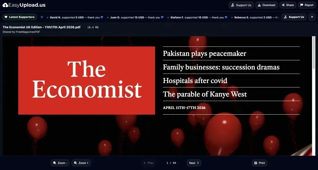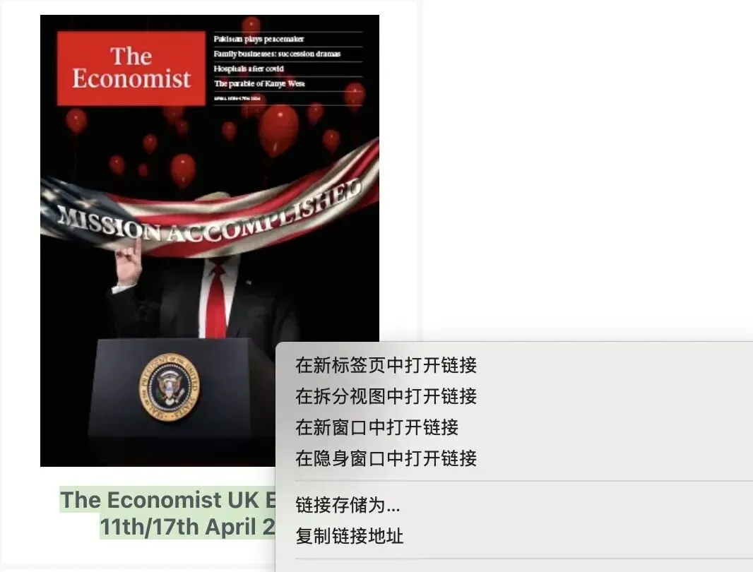 1. 找到目标期刊:进入经济、商业、金融、政治与文化分类,网站每个页面展示24本杂志,该分类足足有387页,粗略计算有9200多本杂志,而且还在持续更新,想要找往期期刊,直接往前翻页即可。这里能找到最新出版的期刊,比如2026年4月11日/17日出版的英国版《经济学人》,在杂志下方会清晰标注出版年月和版本信息。