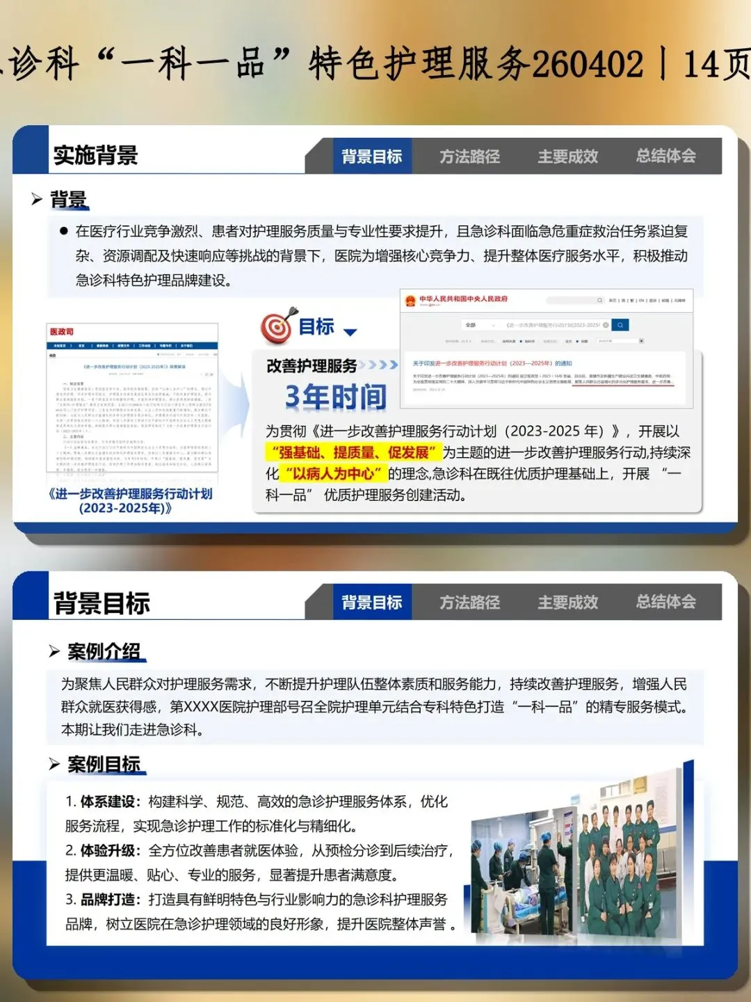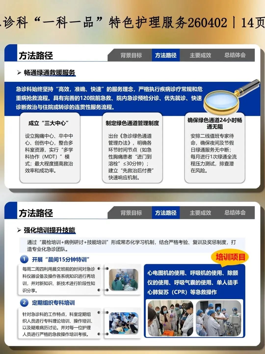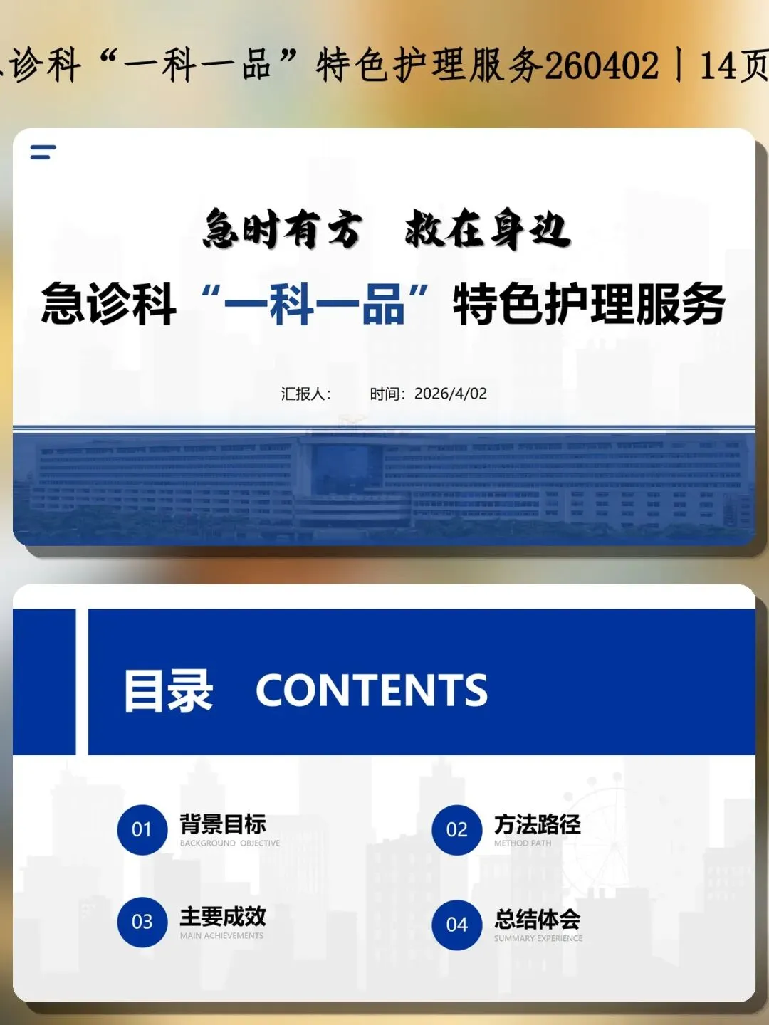 以上就是这套急诊科“一科一品”特色护理服务PPT的核心框架,完整版本包含所有流程图、培训计划表、成效数据图表,需要的同行可以直接获取,拿到就能用于科室汇报、护理查房、服务方案展示,不用再熬夜从零开始排版。