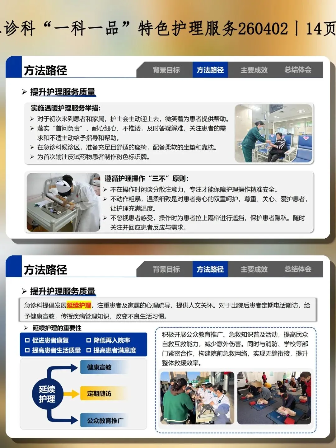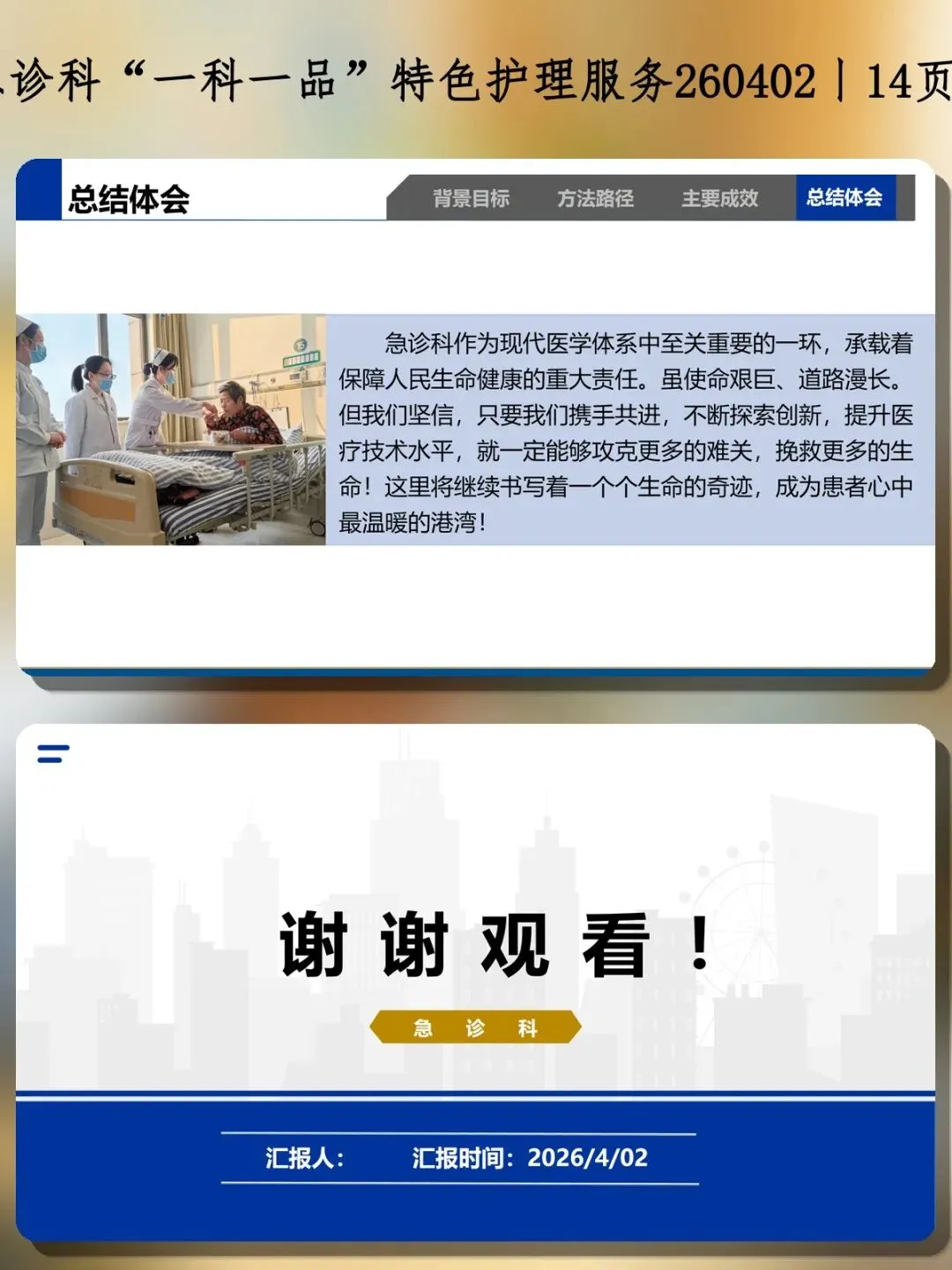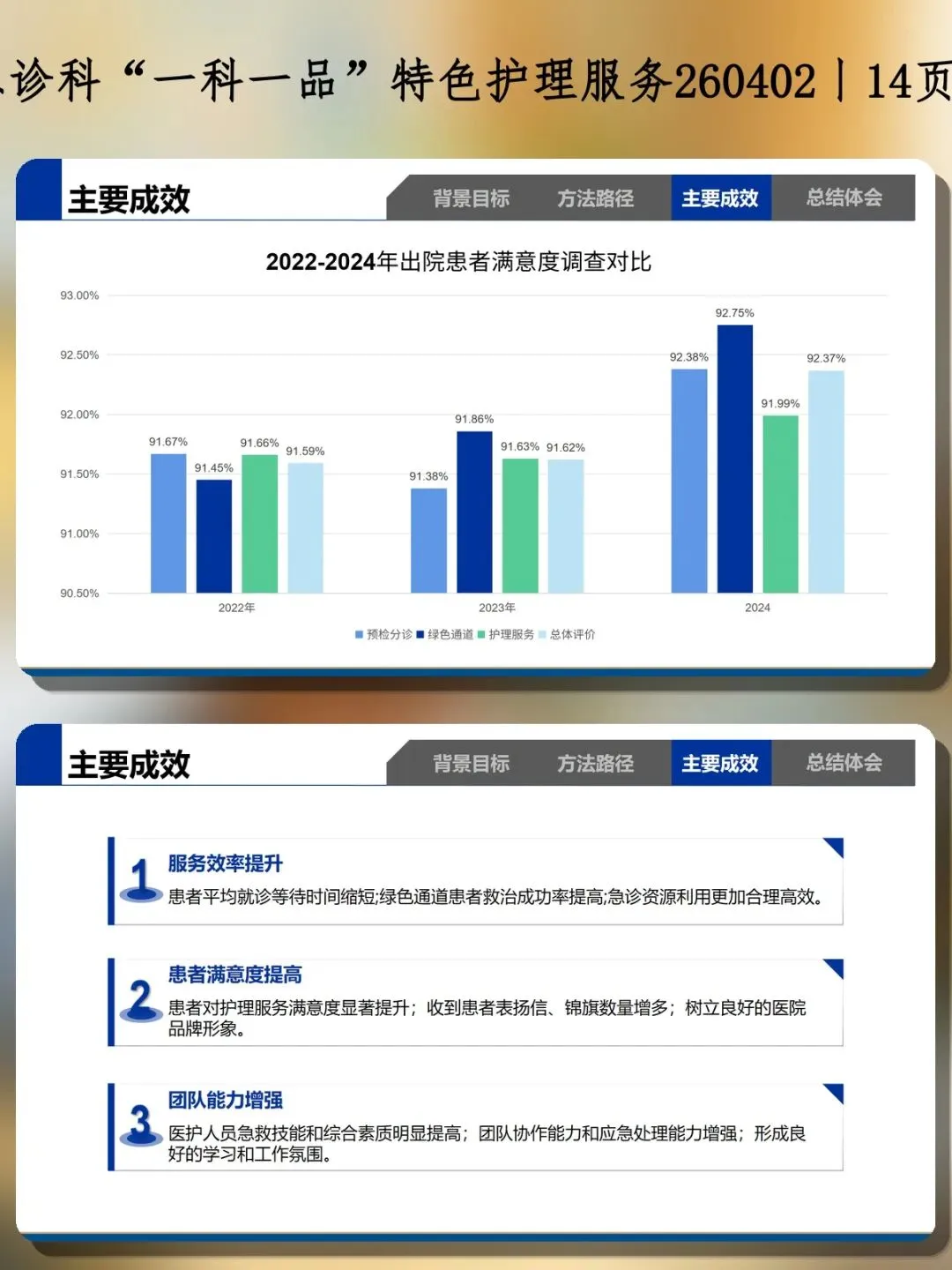 以上就是这套急诊科“一科一品”特色护理服务PPT的核心框架,完整版本包含所有流程图、培训计划表、成效数据图表,需要的同行可以直接获取,拿到就能用于科室汇报、护理查房、服务方案展示,不用再熬夜从零开始排版。