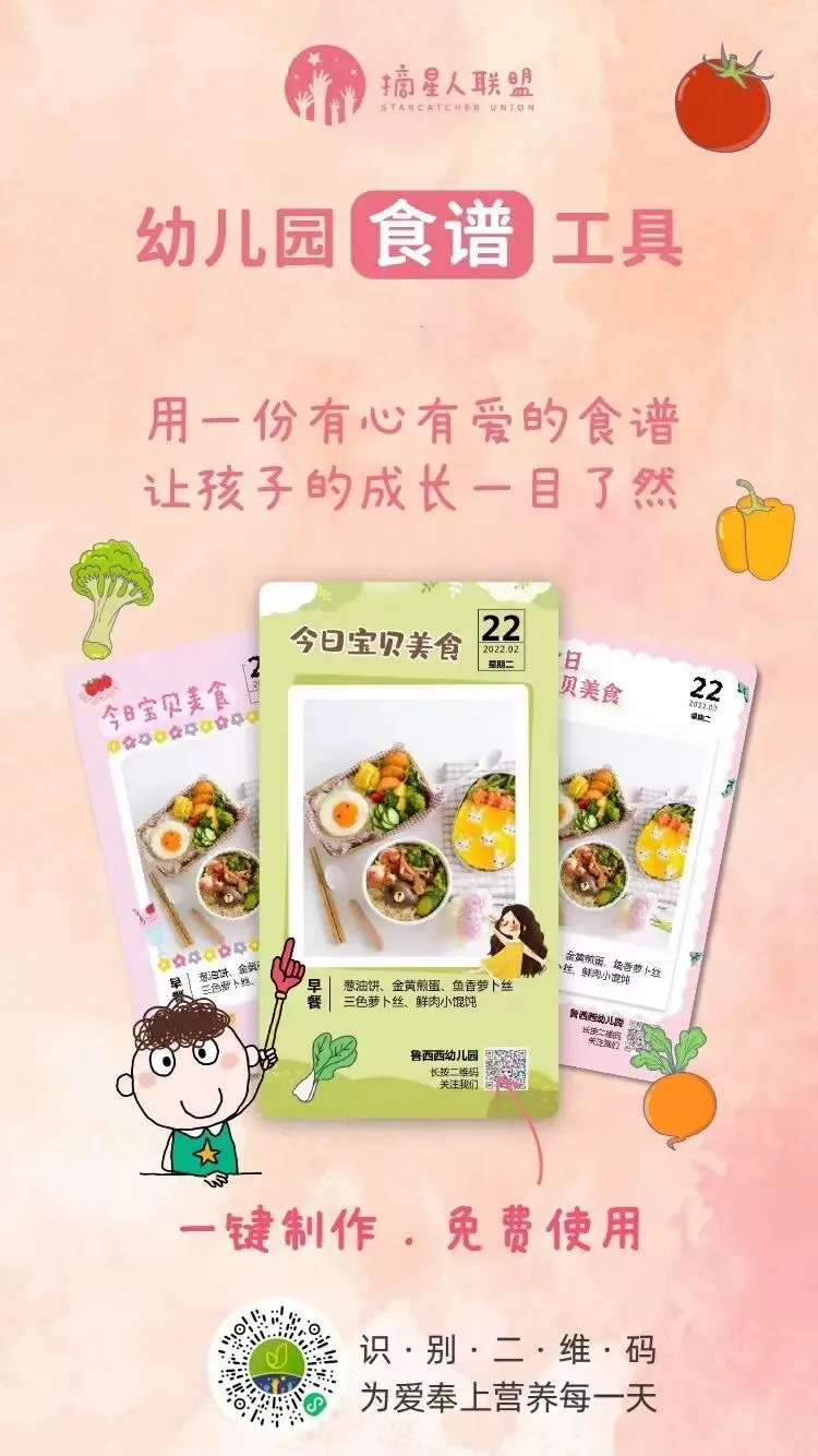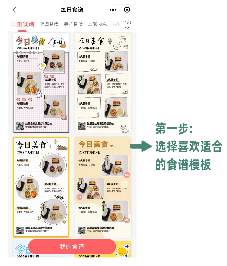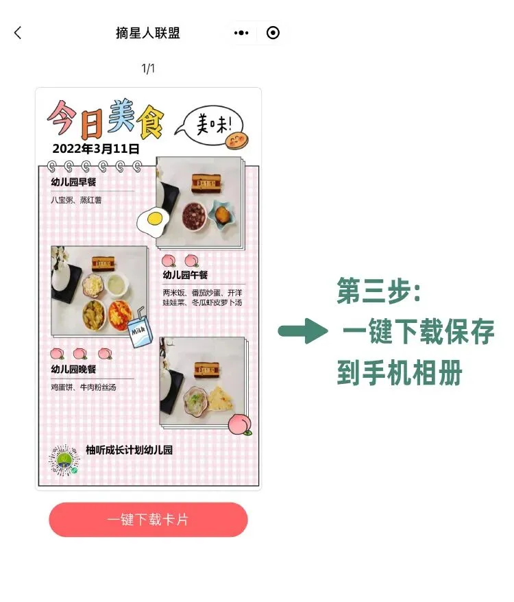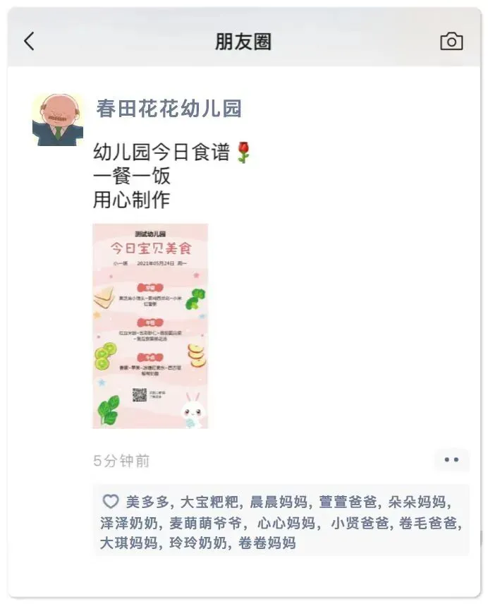 同时随着时间的动线,早餐、午餐、晚餐,各发一张,和家长每一天都可以通过美食分享进行多次互动,让家园关系更加紧密。