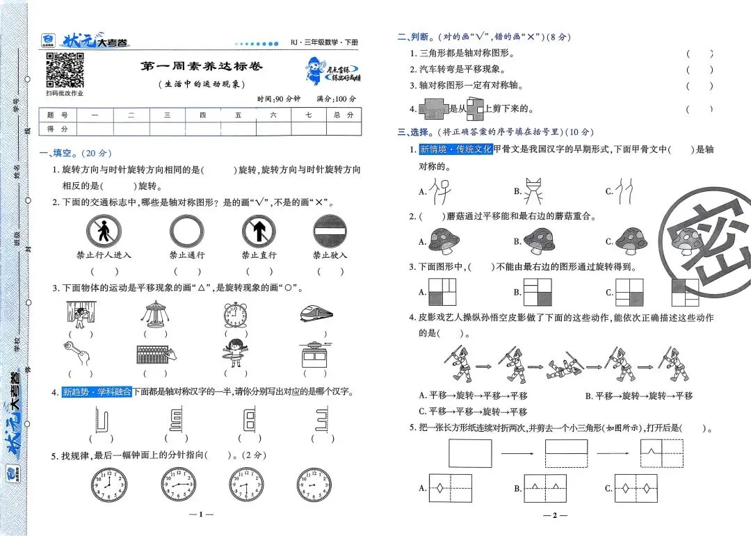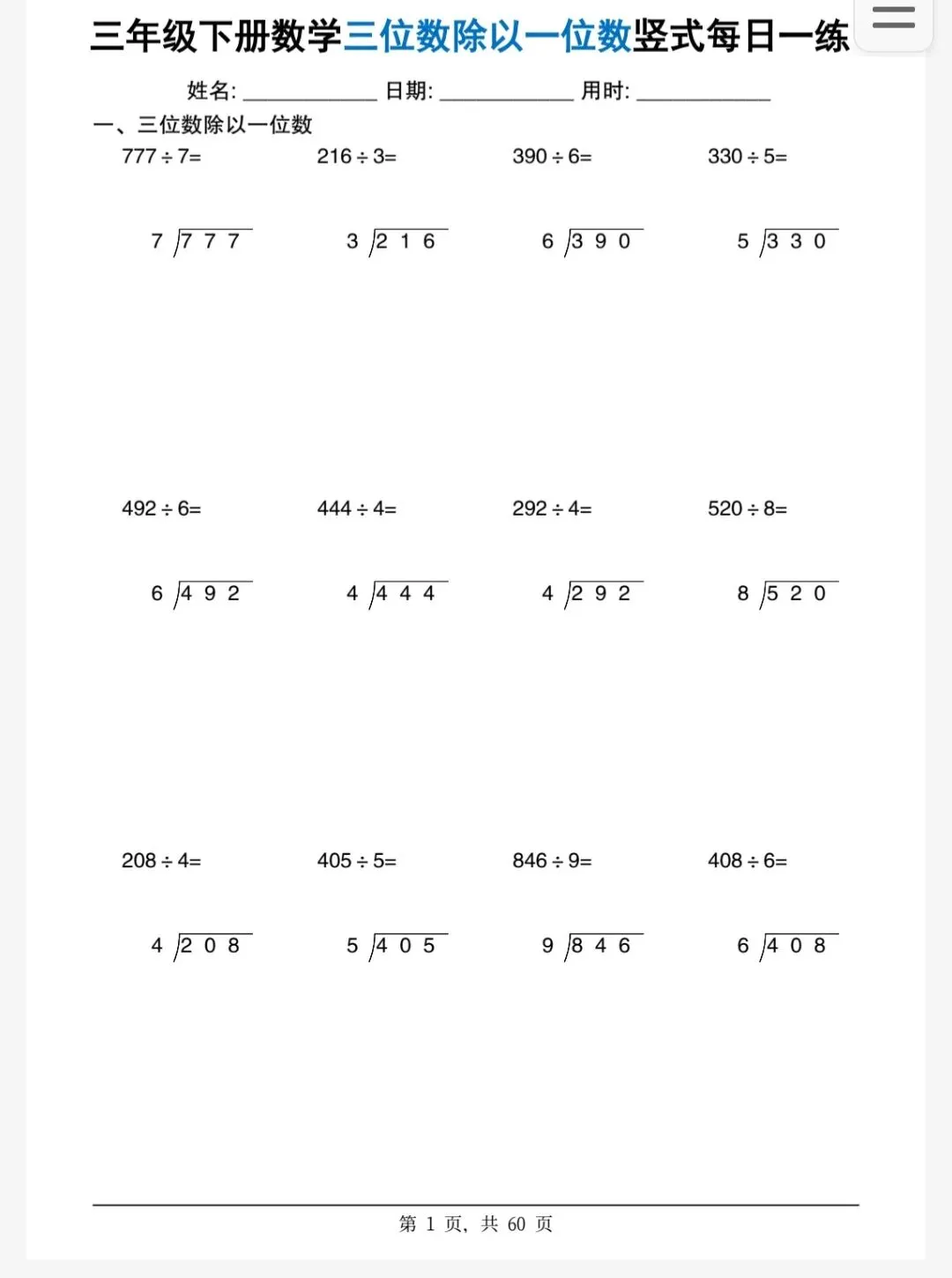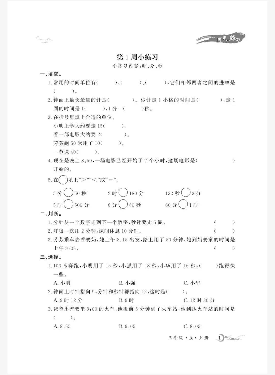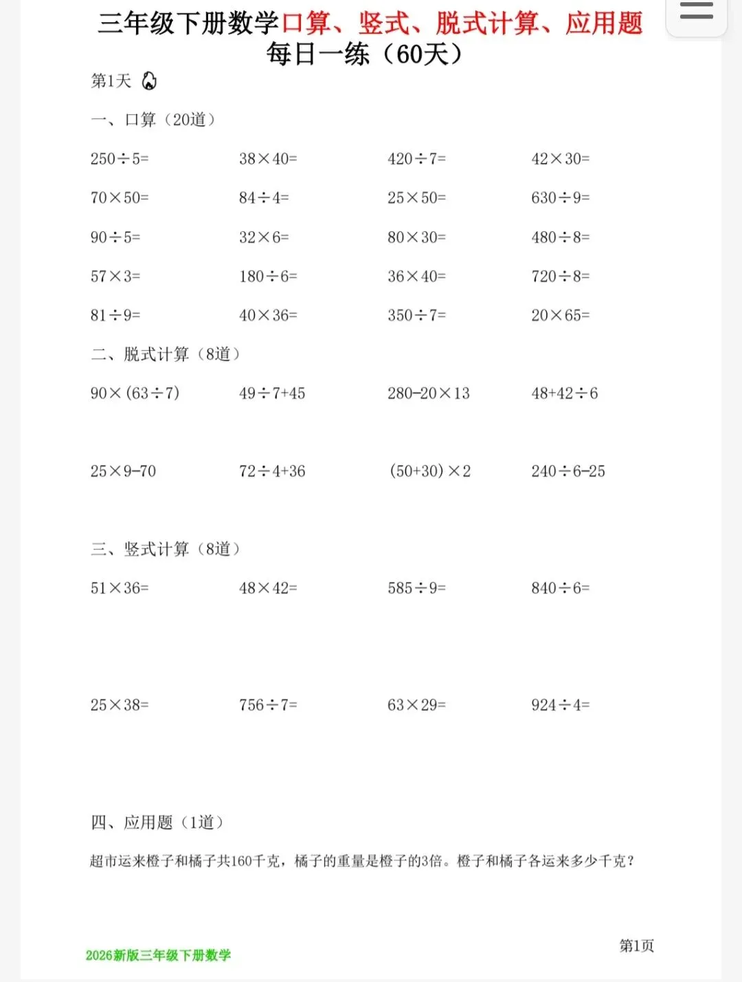 今天给大家分享的是 26春三年级下册数学精品资料 高清可打印,供各位老师提前备课新学期使用!