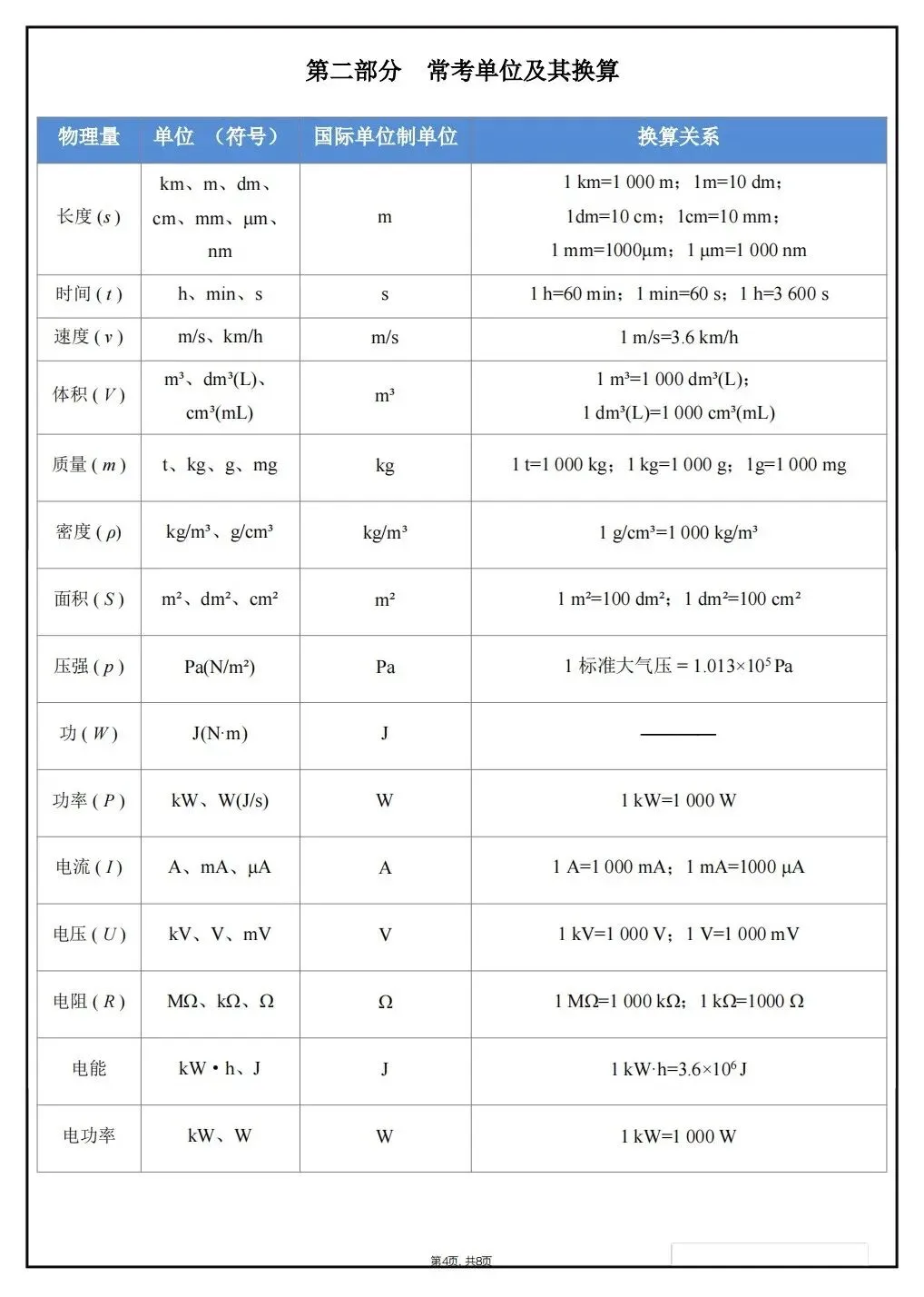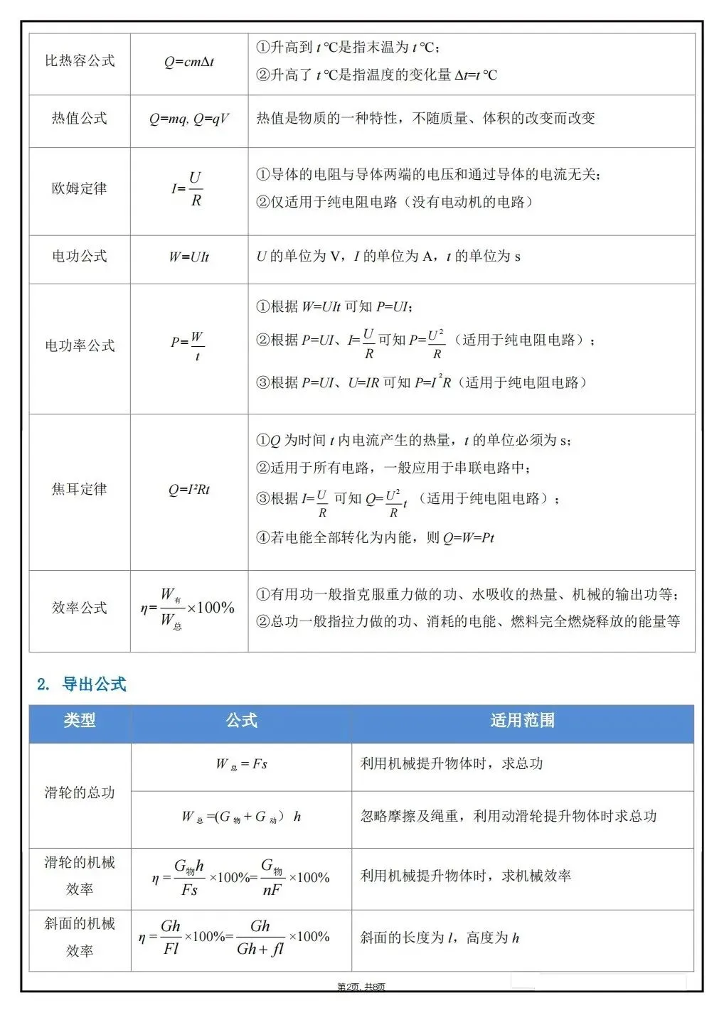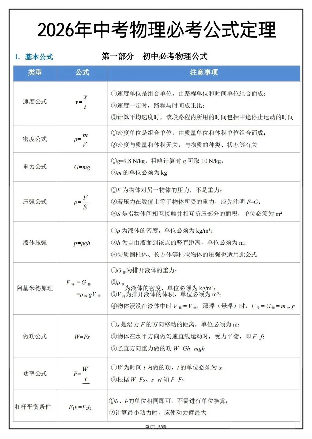 2026新春中考物理必考公式定理(电子版可打印)