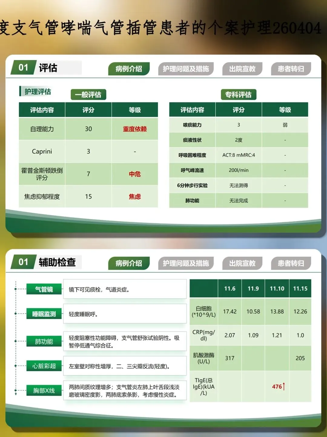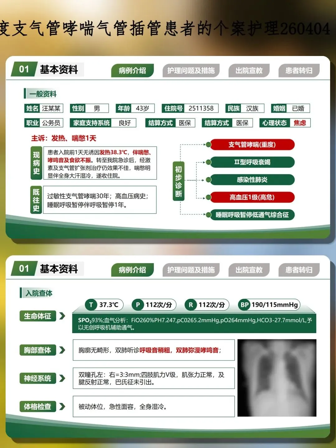 PPT里的这位患者是43岁的男性,因为发热、喘憋入院,诊断为重度支气管哮喘、II型呼吸衰竭。最大的护理难点在于,他痰液粘稠且有痰痂,常规吸痰效果不好,这直接阻碍了脱机进程。