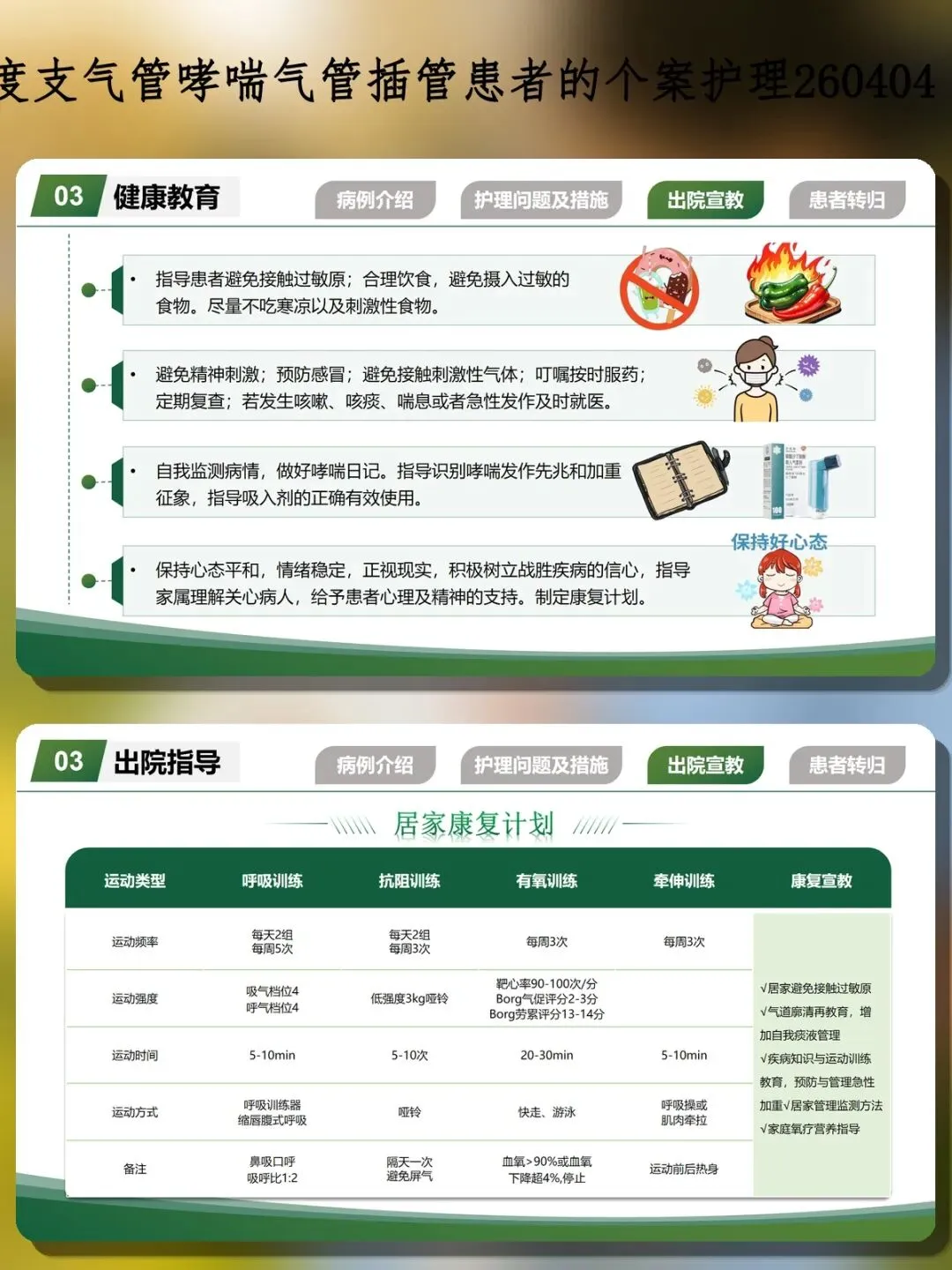 以上就是这套《重度支气管哮喘气管插管患者个案护理》PPT的核心精华内容,完整版本包含20多页专业课件,涵盖了从振动筛孔雾化的具体参数、早期康复的动作图解,到居家康复的详细计划表,是进行个案汇报、科室培训的绝佳参考资料,不用再熬夜翻指南改课件。