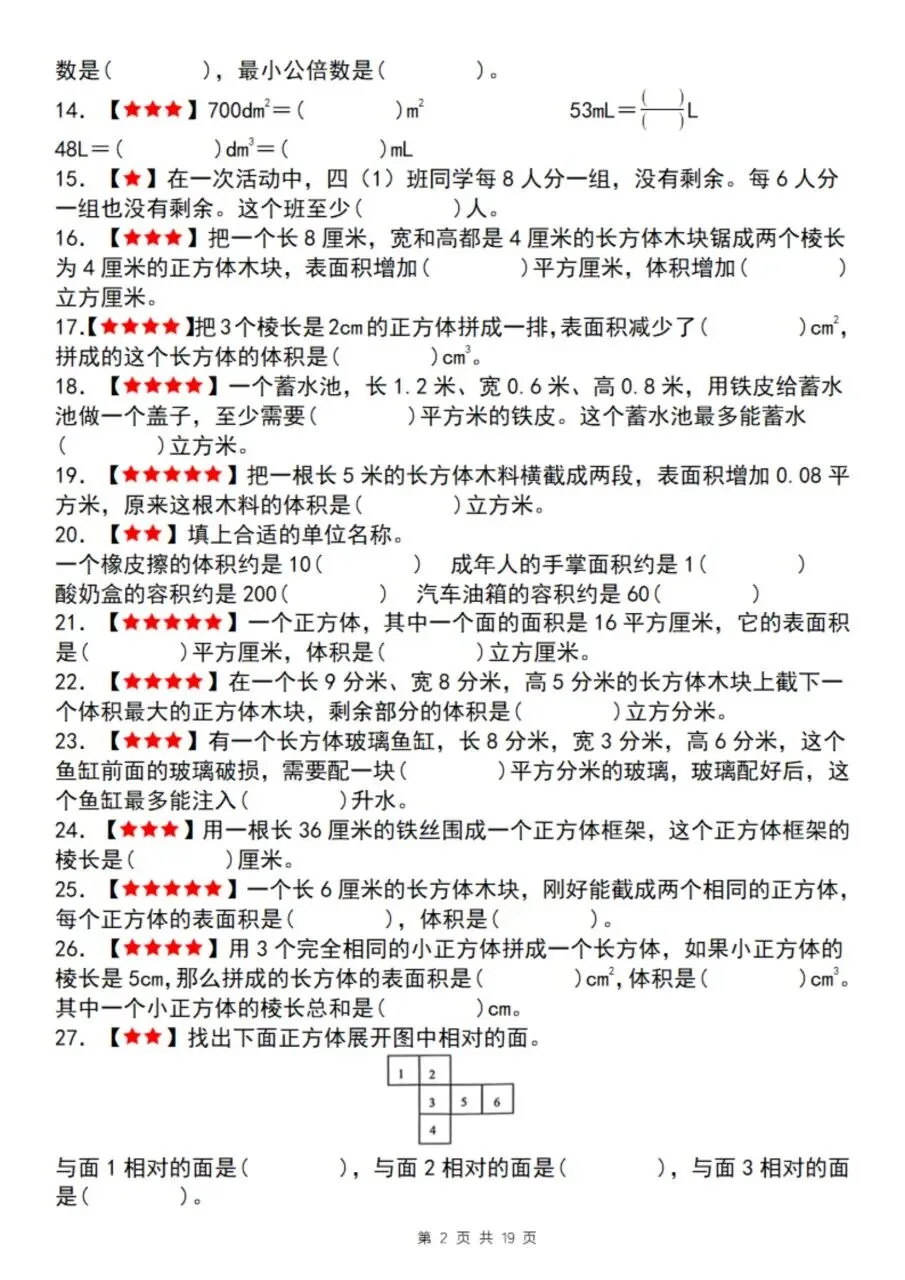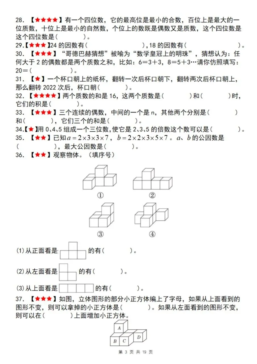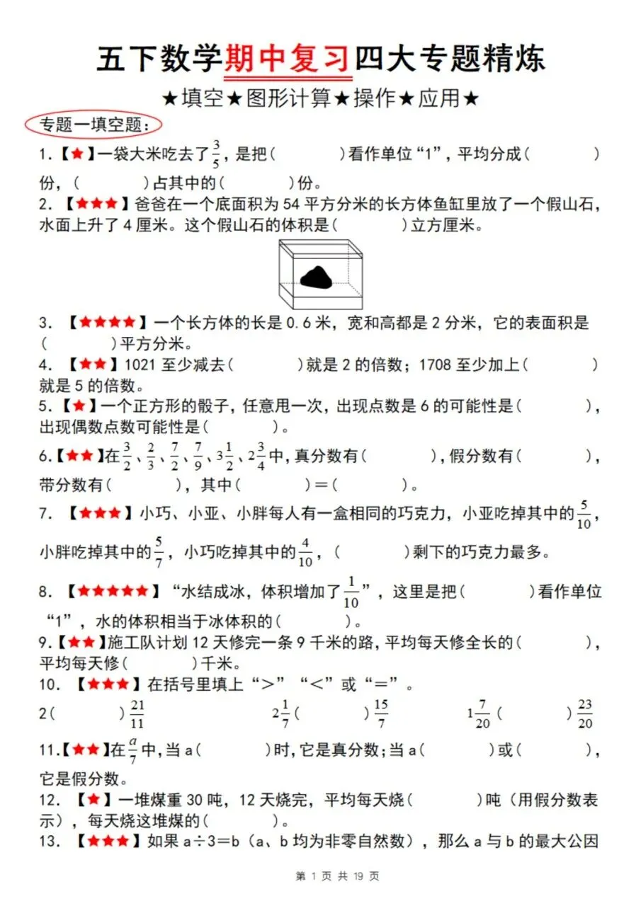 五年级下册数学期中复习专题精练(19页),含填空、图形计算、操作、应用四大专题。40道填空题配详细答案解析,涵盖分数概念、长方体/正方体体积表面积、因数倍数、三视图等核心考点,按难度分级,适合期中系统复习。
