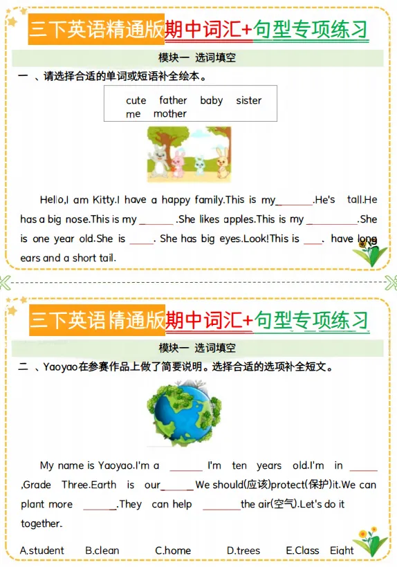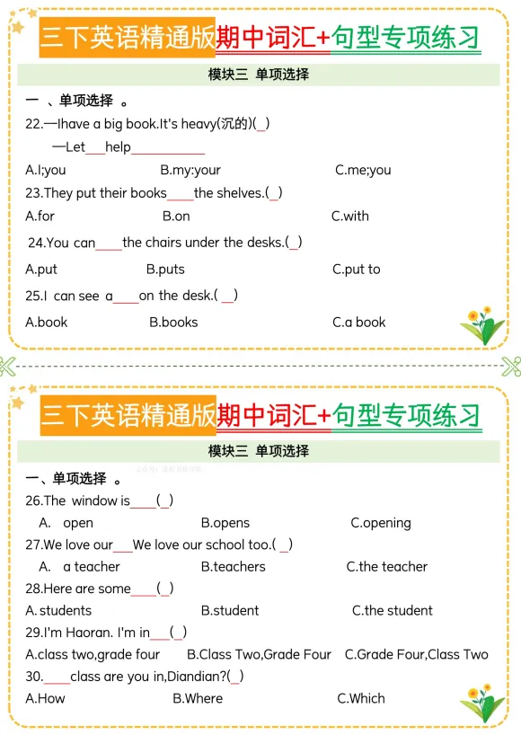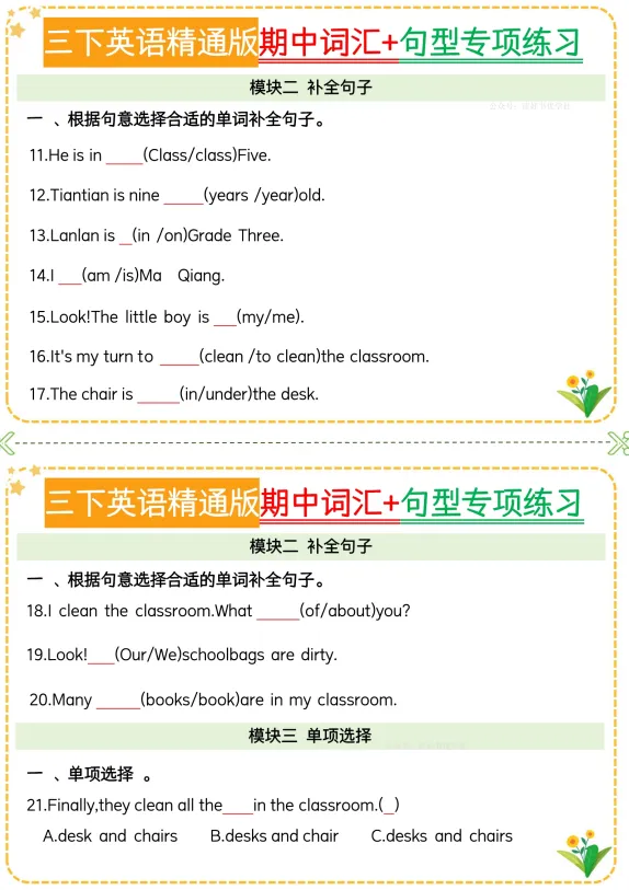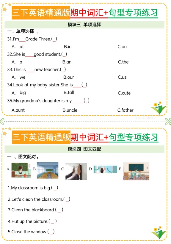 【词汇句型小纸条】三年级下册英语精通版期中词汇句型小纸条,pdf电子版可打印。完整电子版请拉至文末左下角阅读原文处自取,欢迎收藏和下载。