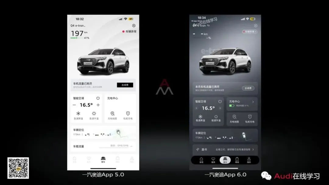 一汽奥迪App 6.0相对于之前的版本,整体采用深色基调搭配渐变光影,里面的卡片由原来的直角变成圆角,另外在下面的主菜单上,采用胶囊悬浮导航设计,看到这些设计,你是否会有似曾相识的感觉?