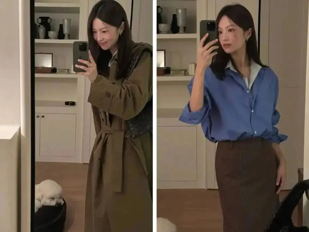 旁边那套蓝衬衫+棕色针织裙也很妙,属于“不穿西装但看起来很专业”,尤其适合需要见客户、又不想穿得太硬的打工人。