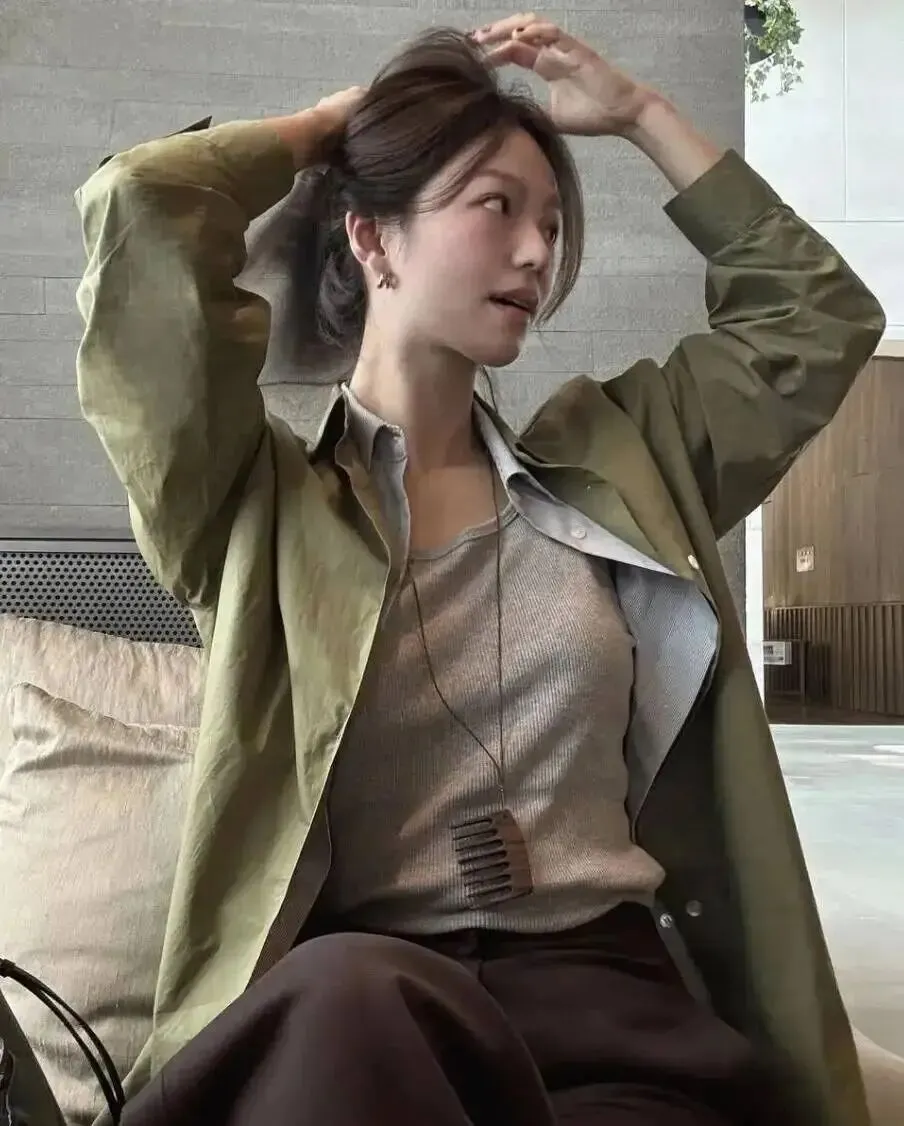她这套出门通勤的示范就很典型:风衣+翻领上衣+深色下装,干净到像把人从“周一焦虑”里洗出来。