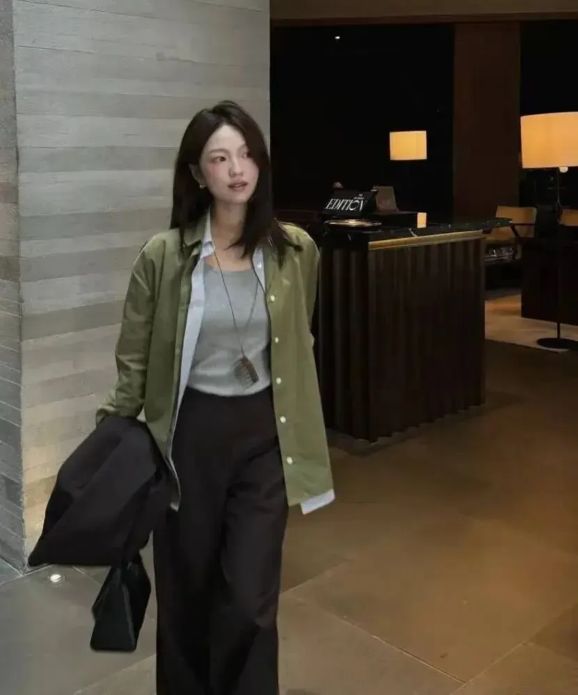 再看她的叠穿:外面一件偏硬朗的绿色衬衫外套,里面灰背心打底。