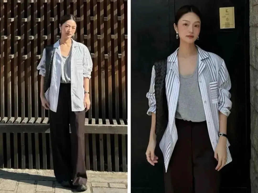 她用灰色背心做内搭,把条纹的“通勤刻板感”削弱掉,再配深色阔腿裤,瞬间变成“清爽的老钱风平替”。