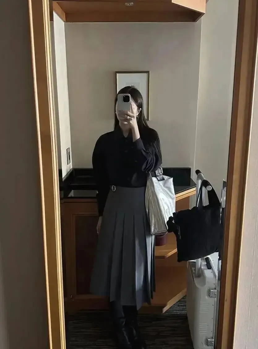 如果你是需要“稍微正式”的岗位,这套黑衬衫+灰色百褶裙可以直接复制。