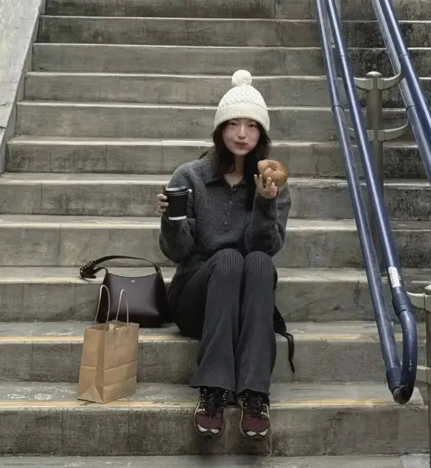 灰毛衣+针织帽+阔腿裤,坐在台阶上喝咖啡,看起来就像刚从一周的KPI里逃出来。
