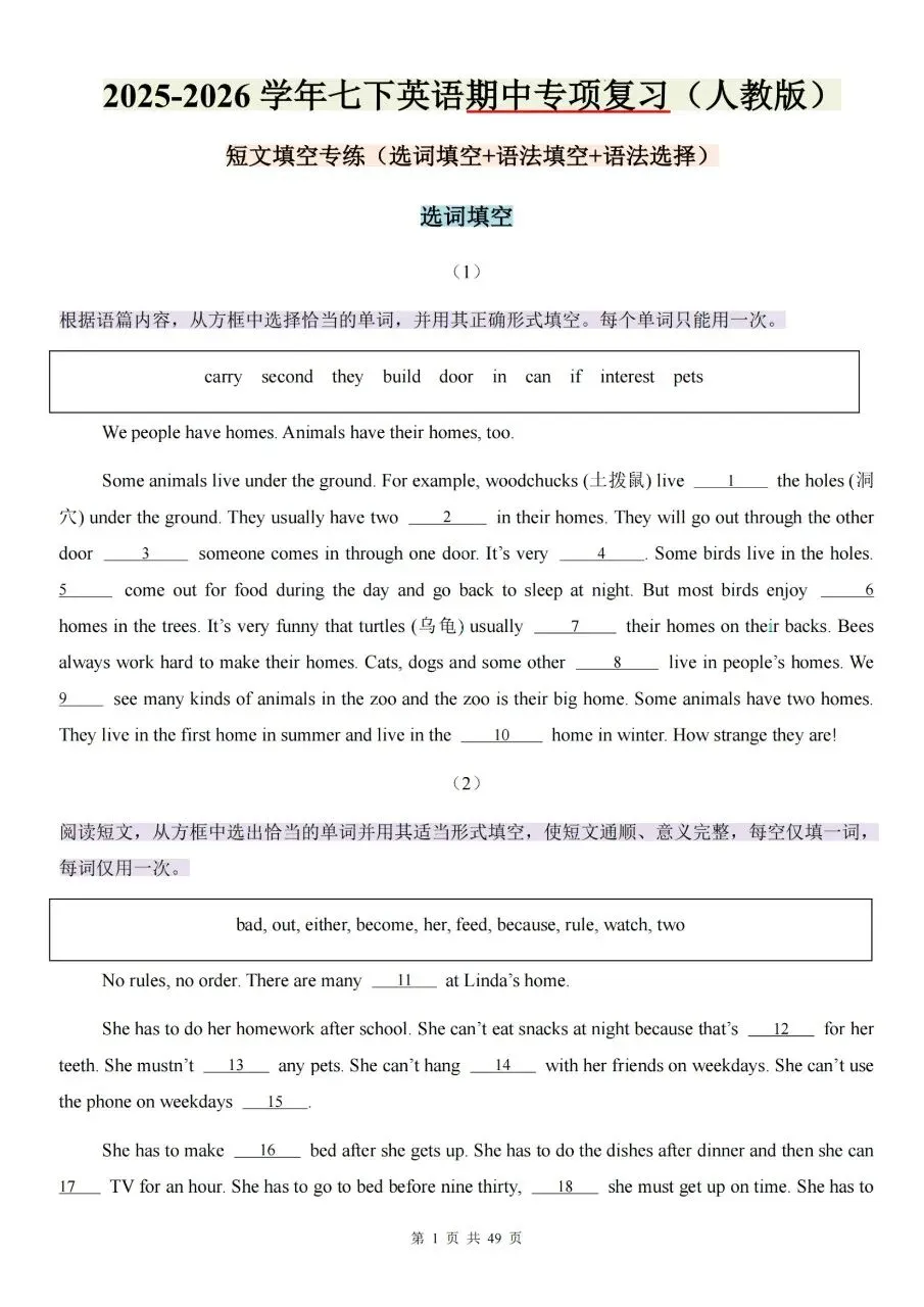 选词填空是七年级下册英语期中必考重难点题型,分值占比高,也是很多同学容易丢分的地方。想要高效刷题、快速提分,这份专项练习一定要好好利用。