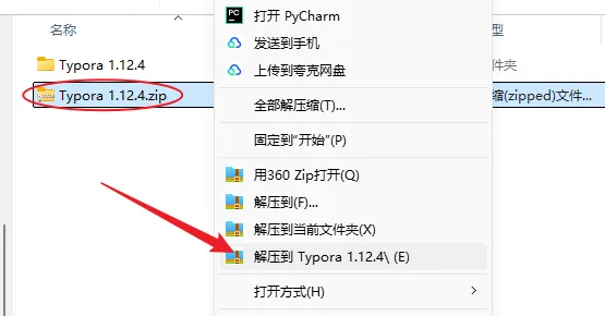 1.解压安装包:鼠标右击【Typora 1.12.4】压缩包,选择电脑上安装的解压软件,点击解压到【Typora 1.12.4】。