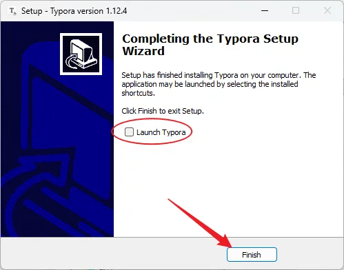 9.取消勾选【Launch Typora】,点击【Finish】。