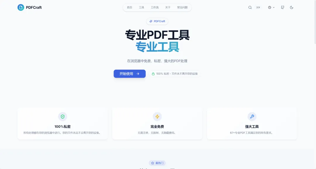 PDFCraft 是一款专为隐私和性能打造的专业级 PDF 工具箱。它最大的卖点就是“纯粹”和“安-全”。跟那些上传文件到云端处理的工具不一样,PDFCraft 利用 WebAssembly 技术,所有的文件处理全都在你自己的浏览器里完成。