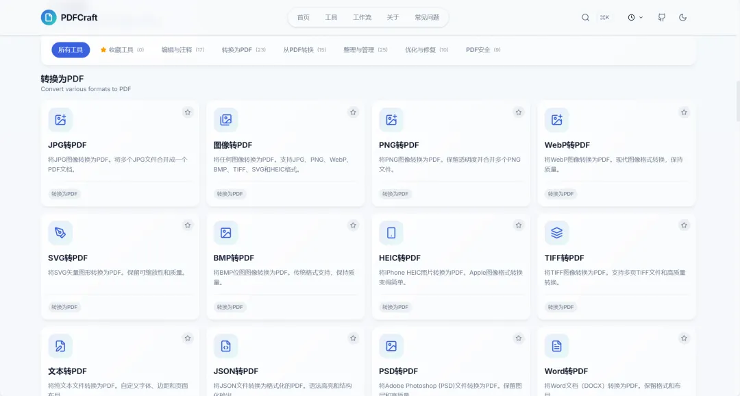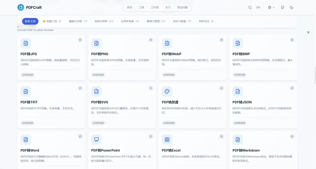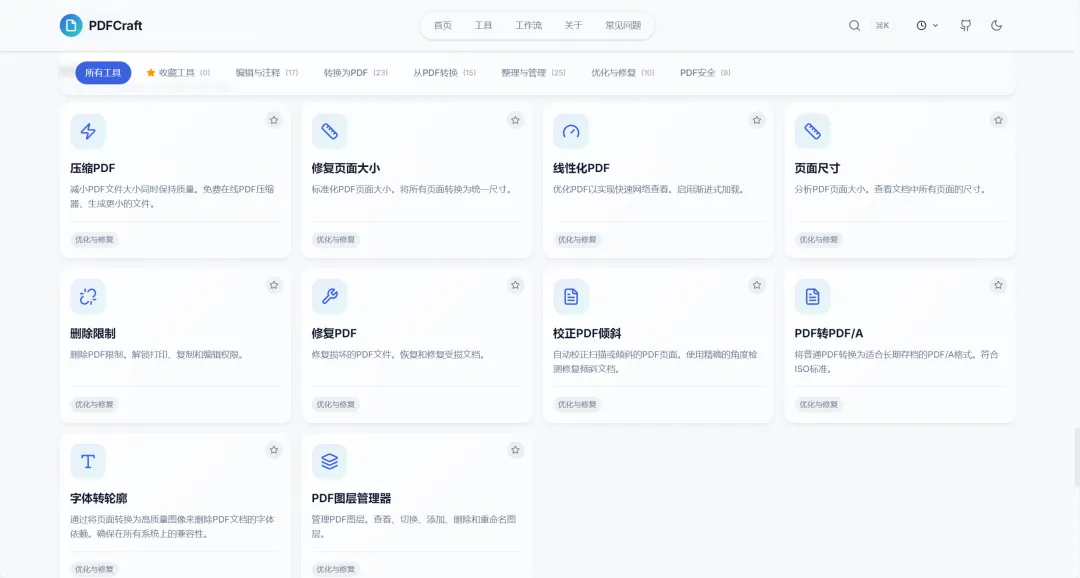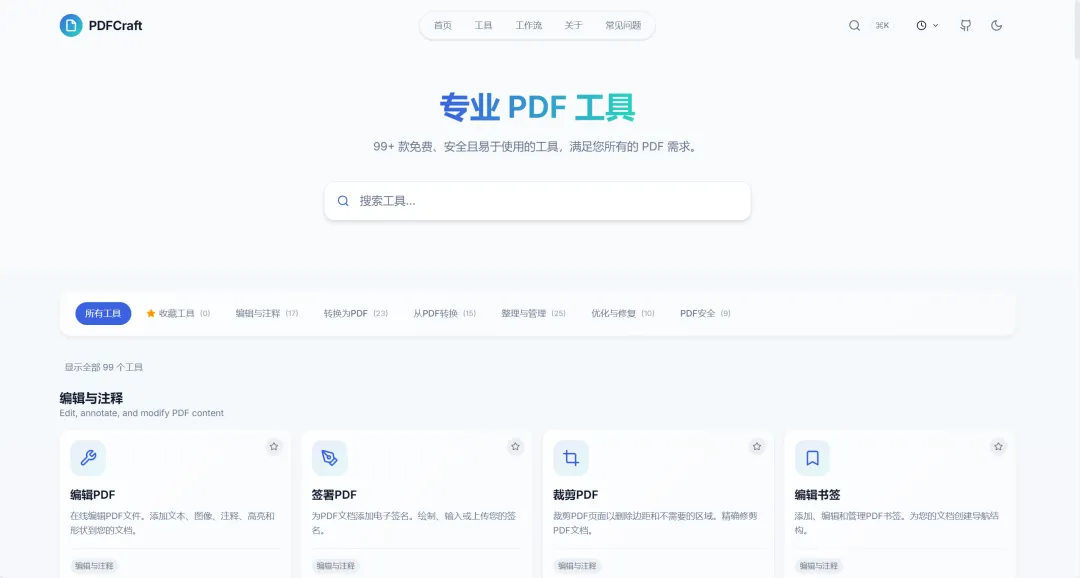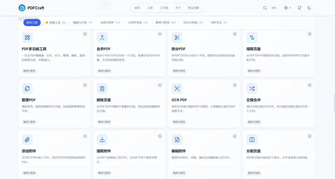 PDFCraft 这个项目确实解决了咱们日常办公中的很多痛点。它把复杂的 PDF 处理能力,用最现代的前端技术栈封装在了一个浏览器页面里,既照顾了功能需求,又完美解决了隐私焦虑。