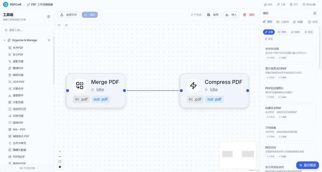 现代化工作流编辑器这个功能真的有点东西。它支持可视化、节点式的工作流编排。你可以把“合并”、“压缩”、“加水印”这些操作像搭积木一样串起来,一次性完成。比如设定好“先合并报表,再添加水印,最后压缩打包”,以后扔进去一堆文件,它就自动按这个流程跑完,效率直接起飞。
