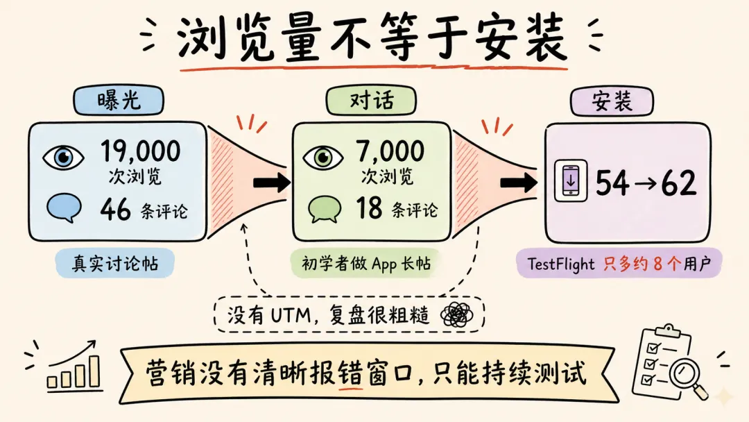 UTM 链接是一种追踪链接来源的参数。(营销人员常用它来判断用户到底来自哪个帖子、哪个渠道。没有 UTM,就只能粗略看 TestFlight 安装数有没有变化。)