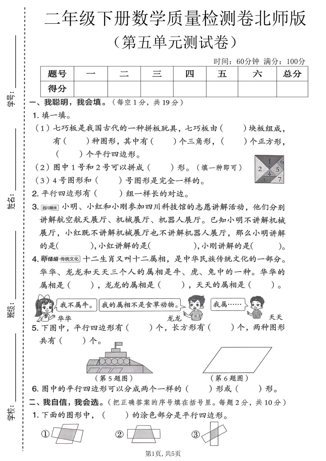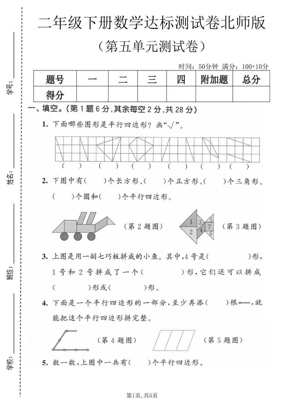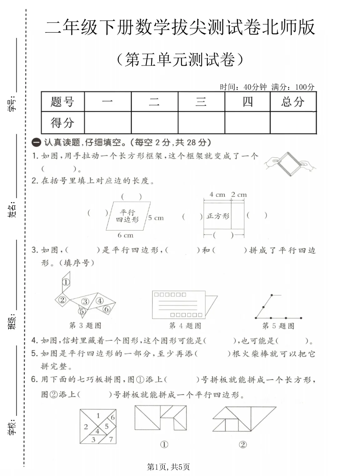 今天给家长们分享的是:二年级下册数学北师版《第五单元测试卷3套带答案》| 完整高清电子版可打印