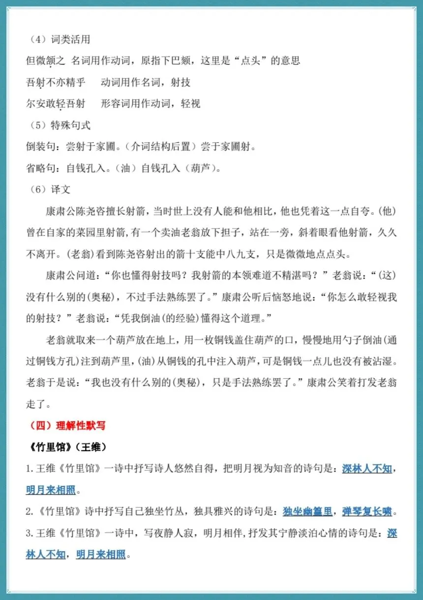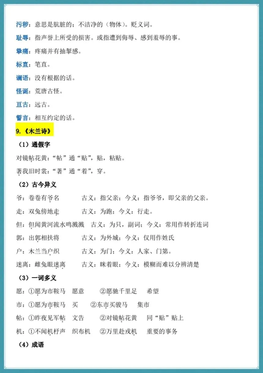 资料按照教材单元的体系来编制,全面覆盖期中考试的核心考点:对字音字形进行准确标出,把容易读错、写错的字全部包括在内;重点词语解释简洁易记,去掉了冗长的描述;文言文核心考点(通假字、古今异义、一词多义、特殊句式、全文翻译)详细梳理,《孙权劝学》、《木兰诗》、《卖油翁》、《陋室铭》、《爱莲说》等必考篇目全都包含其中;古诗文理解性默写优化简化,去除重复的部分,直击得分的关键句子。