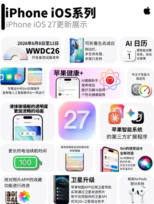 苹果这波爆料,信息量不小。距离WWDC 6月9日开幕越来越近,iOS 27的方向基本清晰了:没有特别夸张的大改版,也没有满天飞的新功能,更没有重新做一套视觉系统,重点就两件事,Siri重做,以及系统体验打磨。