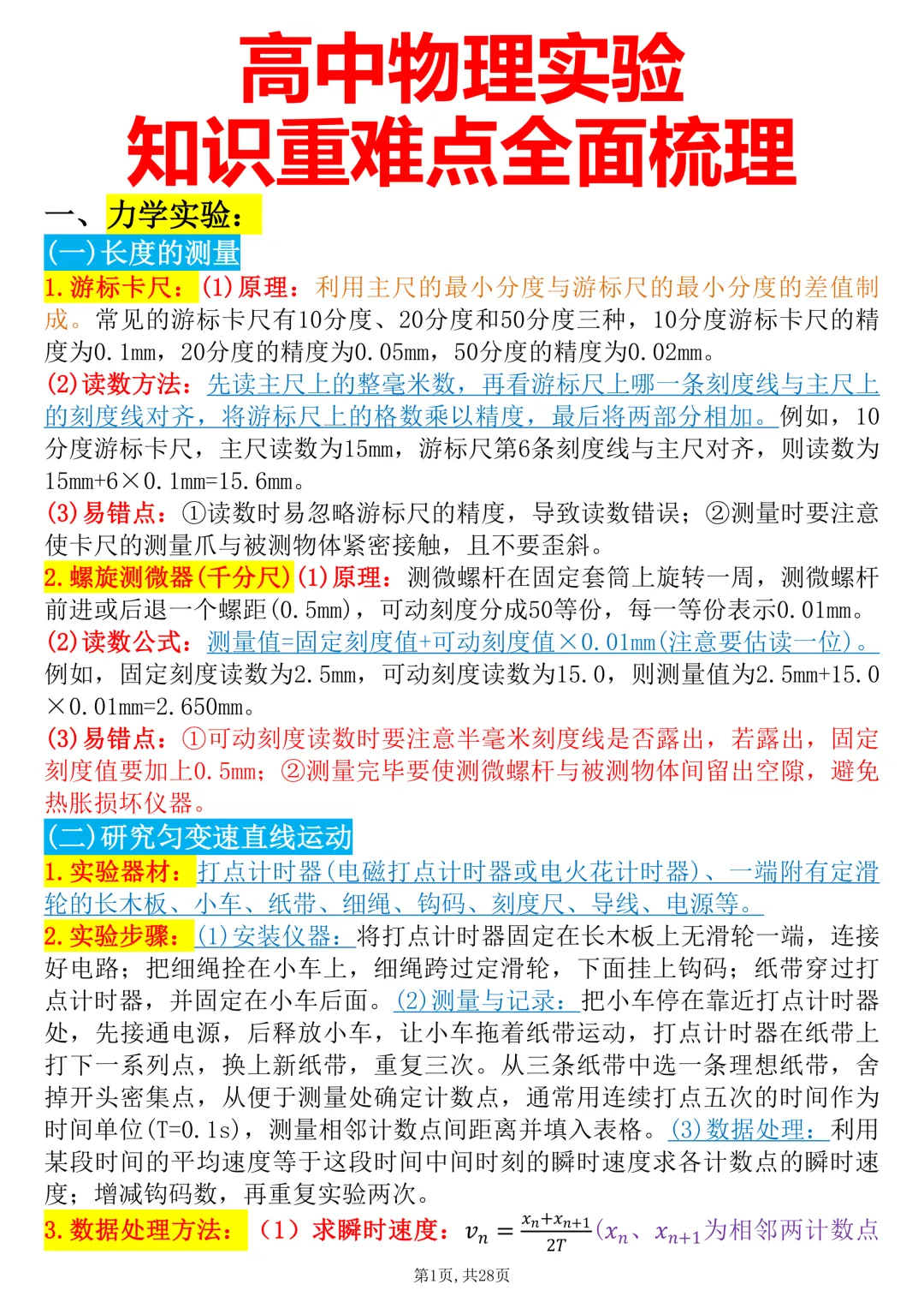 老师推荐:高中物理实验知识点全面梳理,可打印总共28页,受文章篇幅限制,仅能分享部分内容~领取方法: 1、关注下方公众号2、在对话框中回复“ 资料获取 ”即可获取完整电子版更多干货持续更新中,觉得有用就点个❤️支持一下吧~