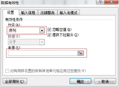 3.在弹窗中,允许中选择“序列”,来源中输入下拉选项,选项间用“用英文逗号隔开”。