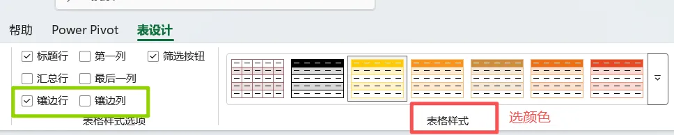 在“表设计”选项卡里,称为镶边行/镶边列。即可有最出的效果。这里的,第一列&最后一列,对其✔,对应的列的内容会加粗。