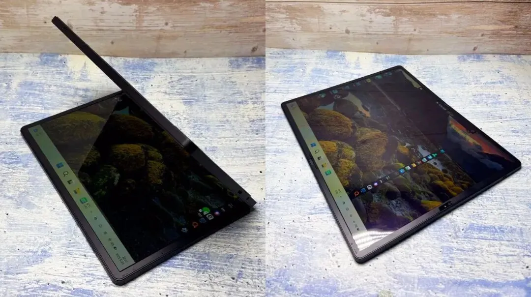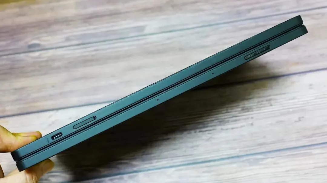 折叠后便12英寸双屏。折叠使用Fold16,它的观感瞬间大变。变化最显著的是机器体积减半,变得更加迷你,是真的笔记本形态,随手放在包里,夹在文件袋里,没有违和感。不过,因为不像折叠屏手机存在副屏,Fold16完全折叠下使用难以实现,必须要将屏幕打开90度以上,可这时候又有新问题,折痕处显示会有瑕疵,全屏编辑和设计文档时,影响较大,只能刻意调整软件显示窗口位置,还得防止折叠区域误触,有点小麻烦。
