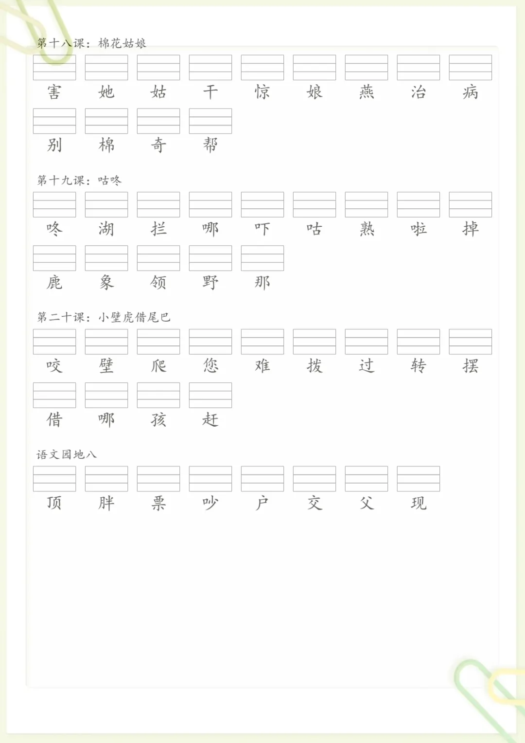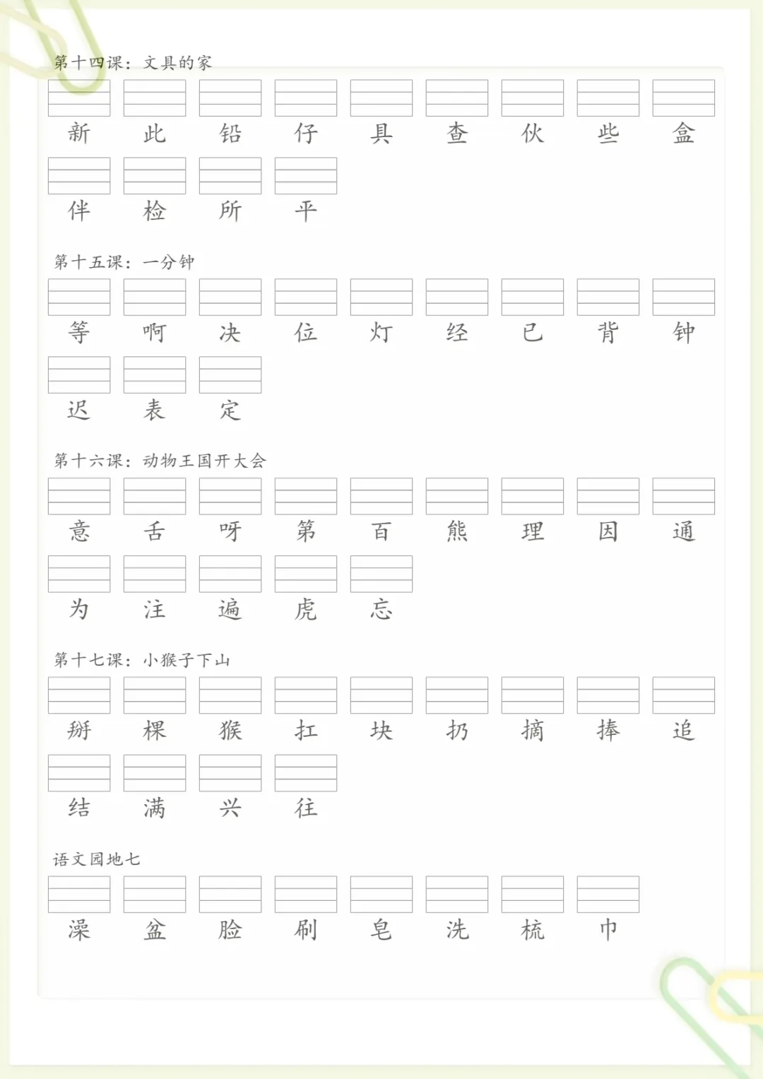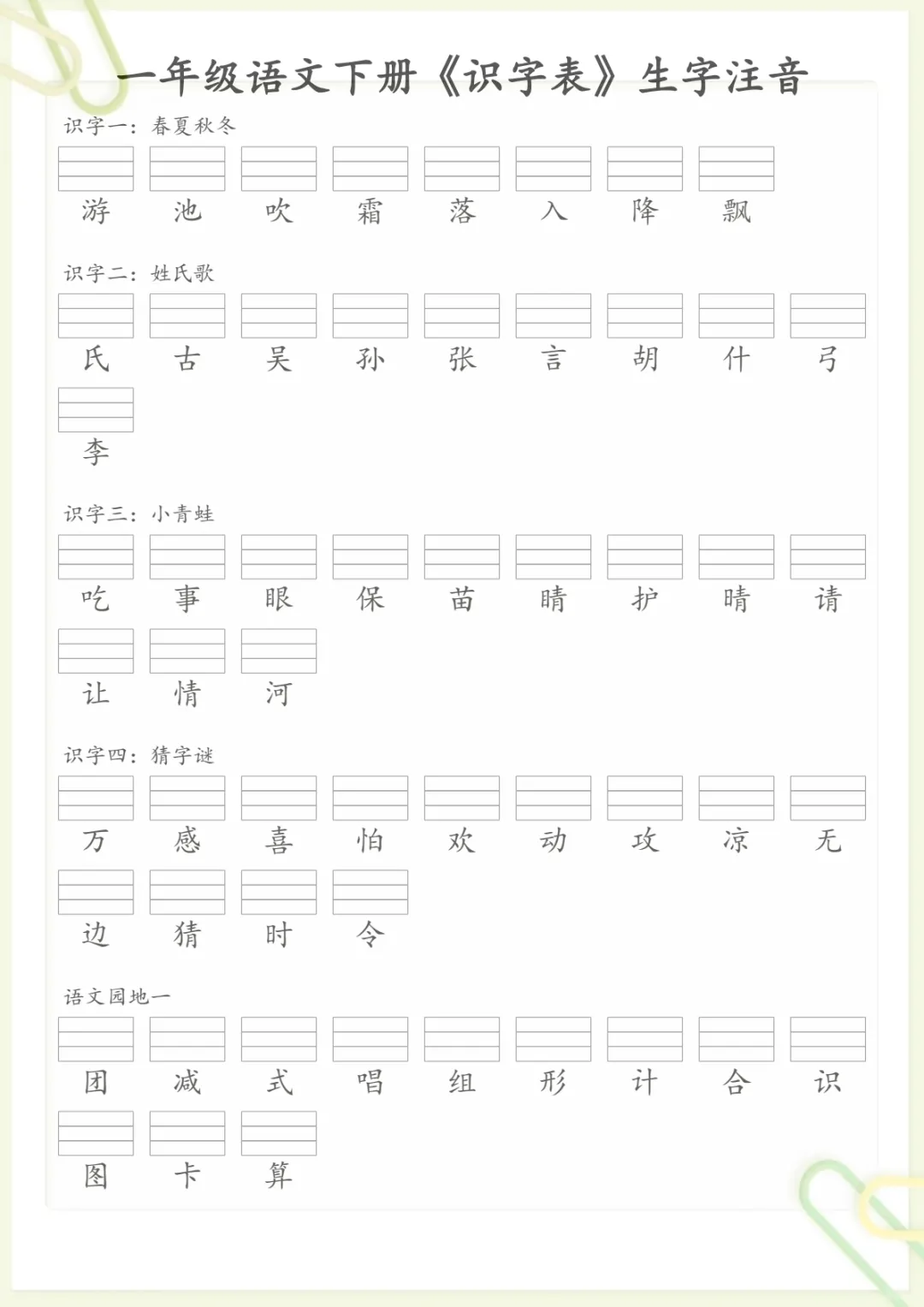 《识字表》生字注音一下语文,共16页,电子版可下载可打印,这份资料围绕一年级下册语文识字学习整理,重点帮助孩子熟悉识字表中的生字读音,巩固注音认读基础,同时涵盖多个核心知识点与专项训练内容,适合课内同步练习和课后复习使用。家长可以提前下载打印出来,让孩子边读边认边巩固,帮助打牢语文识字基础。