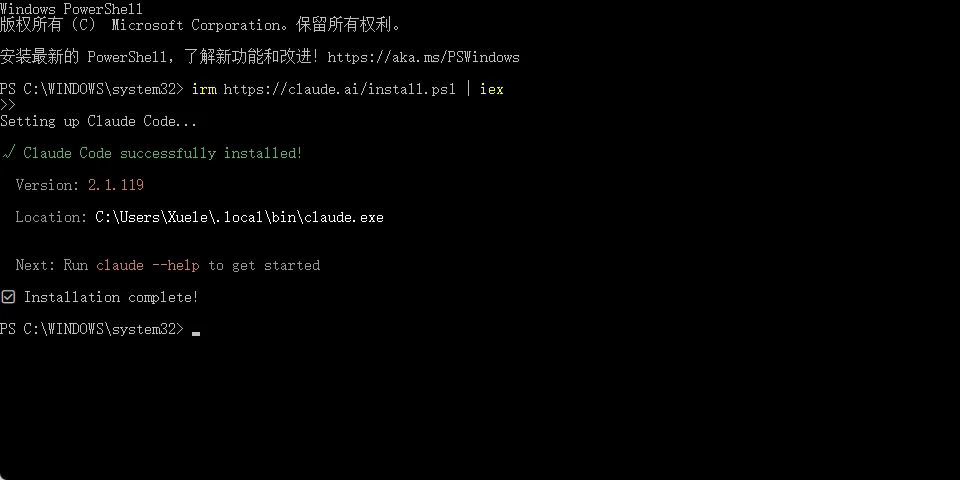 irm https://claude.ai/install.ps1 | iexInstallation complete! 安装完成