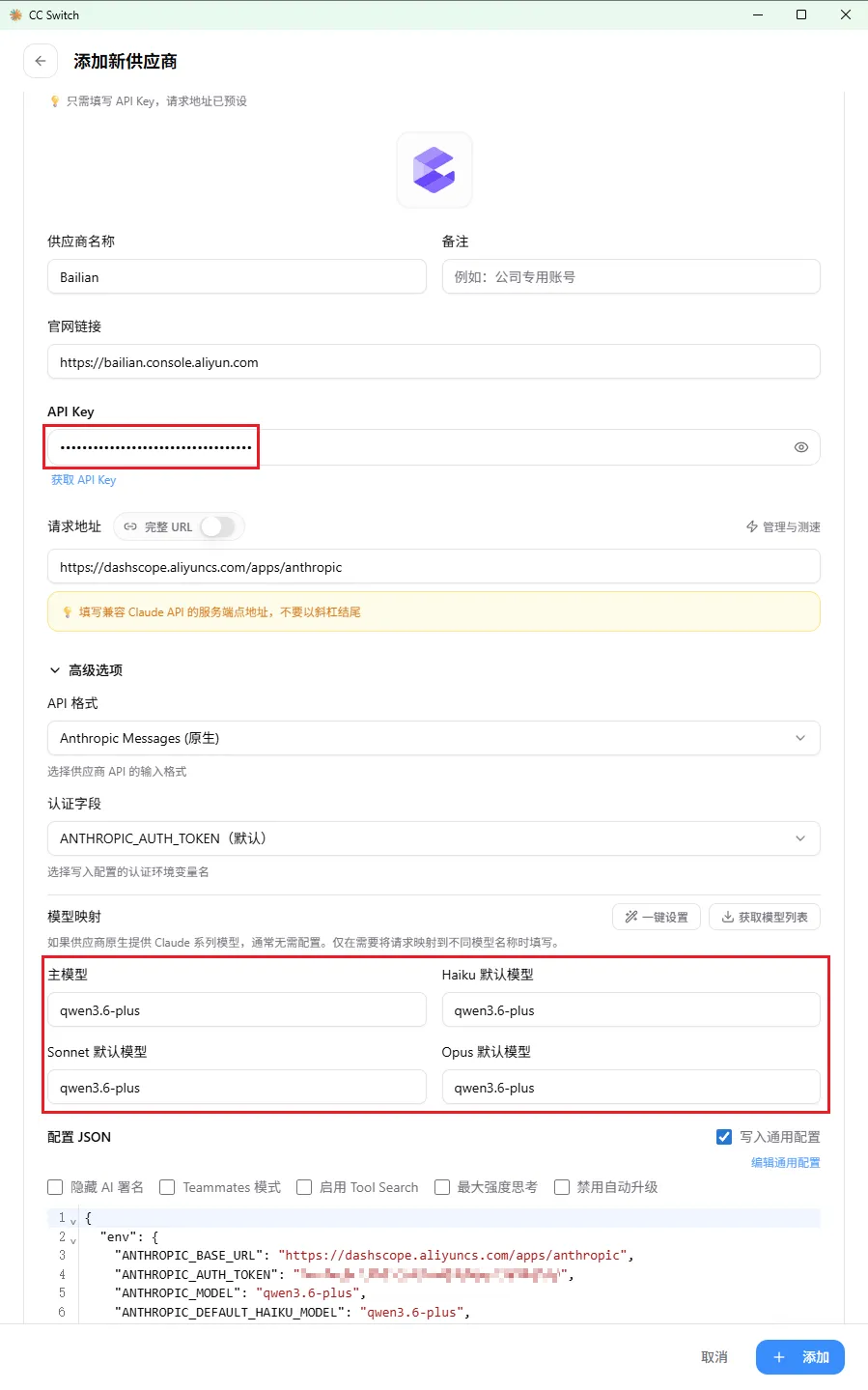 核心填写“API KEY”和“模型映射”,点击添加即可