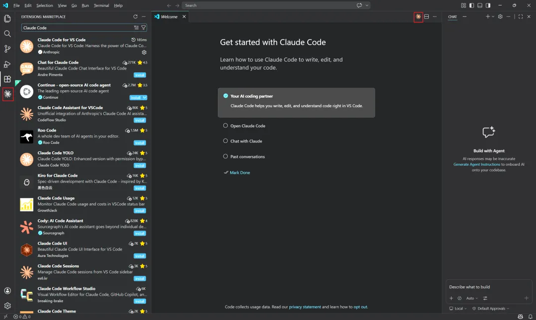 最左侧的侧边栏和右上方有个 Claude Code 的 icon,以右上方为例,点击后