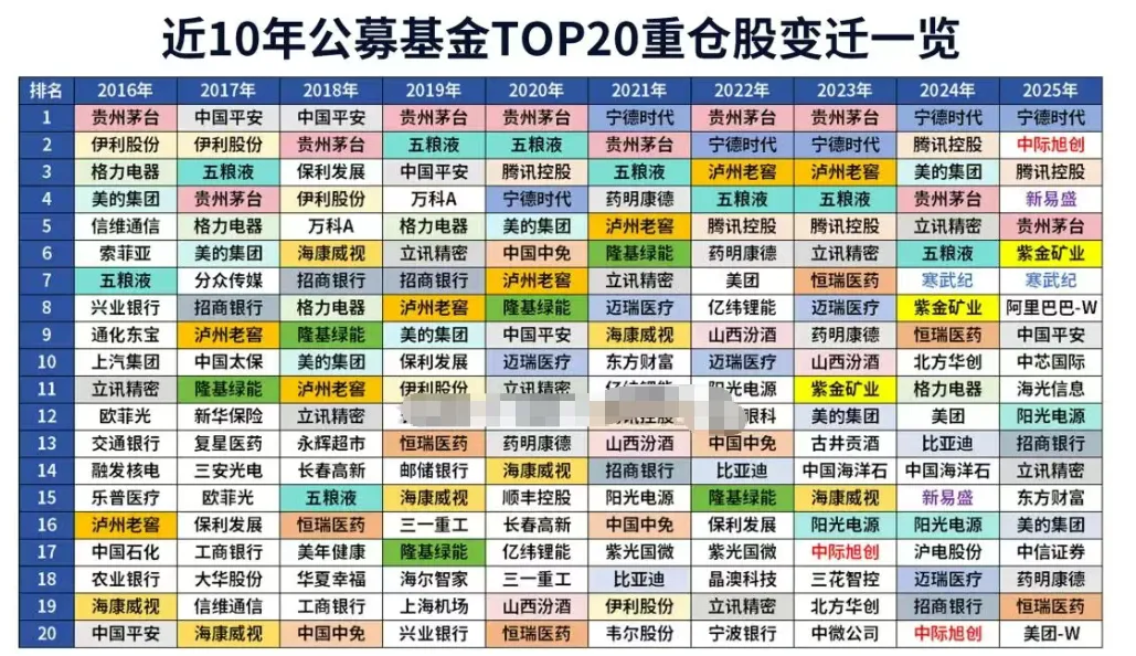 从最新公募基金重仓股看,中际旭创、新易盛、寒武纪、中芯国际、海光信息成为公募基金最新重仓股,泸州老窖、五粮液、山西汾酒分红跌出公募基金持仓TOP20名单。