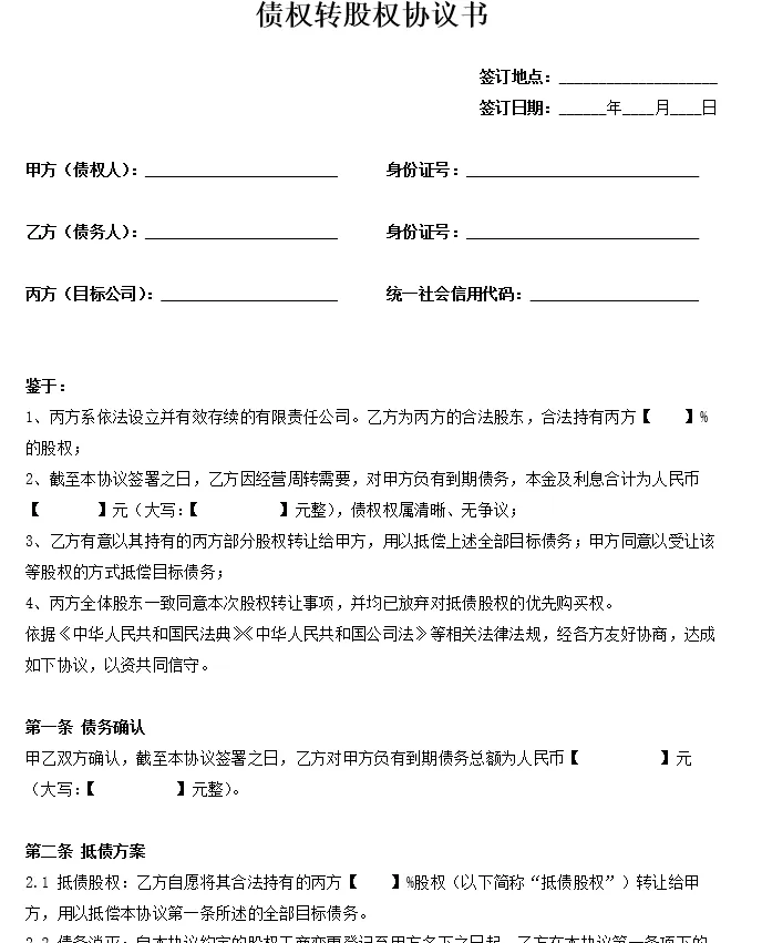 2.1 抵债股权:乙方自愿将其合法持有的丙方【】%股权(以下简称“抵债股权”)转让给甲方,用以抵偿本协议第一条所述的全部目标债务。