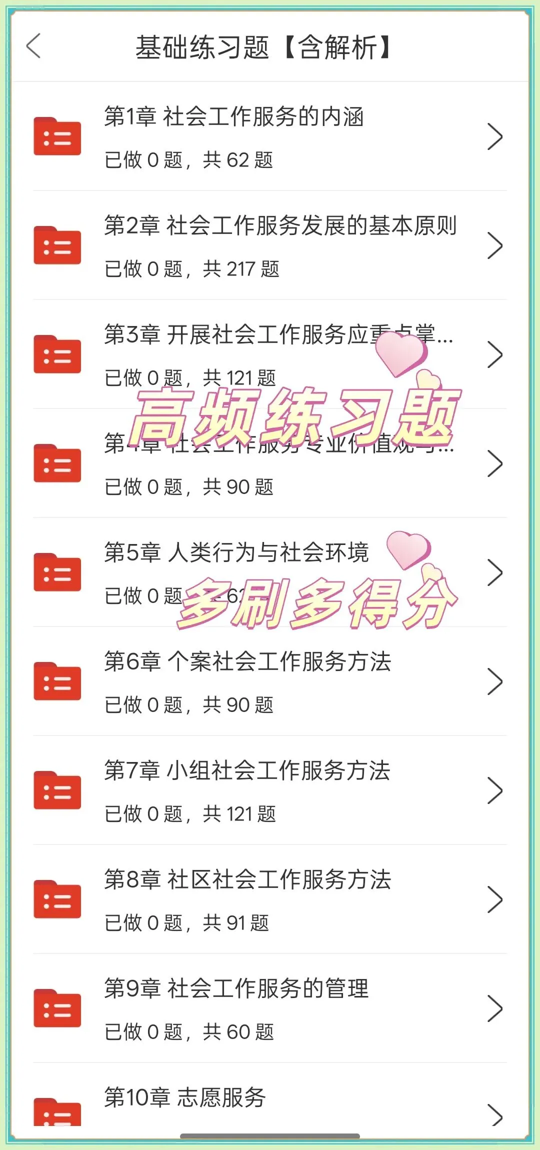 📖实务:重点在儿童、老年、残疾人、矫正、社会救助、社区工作,多记服务流程和介入策略,案例题占比高。