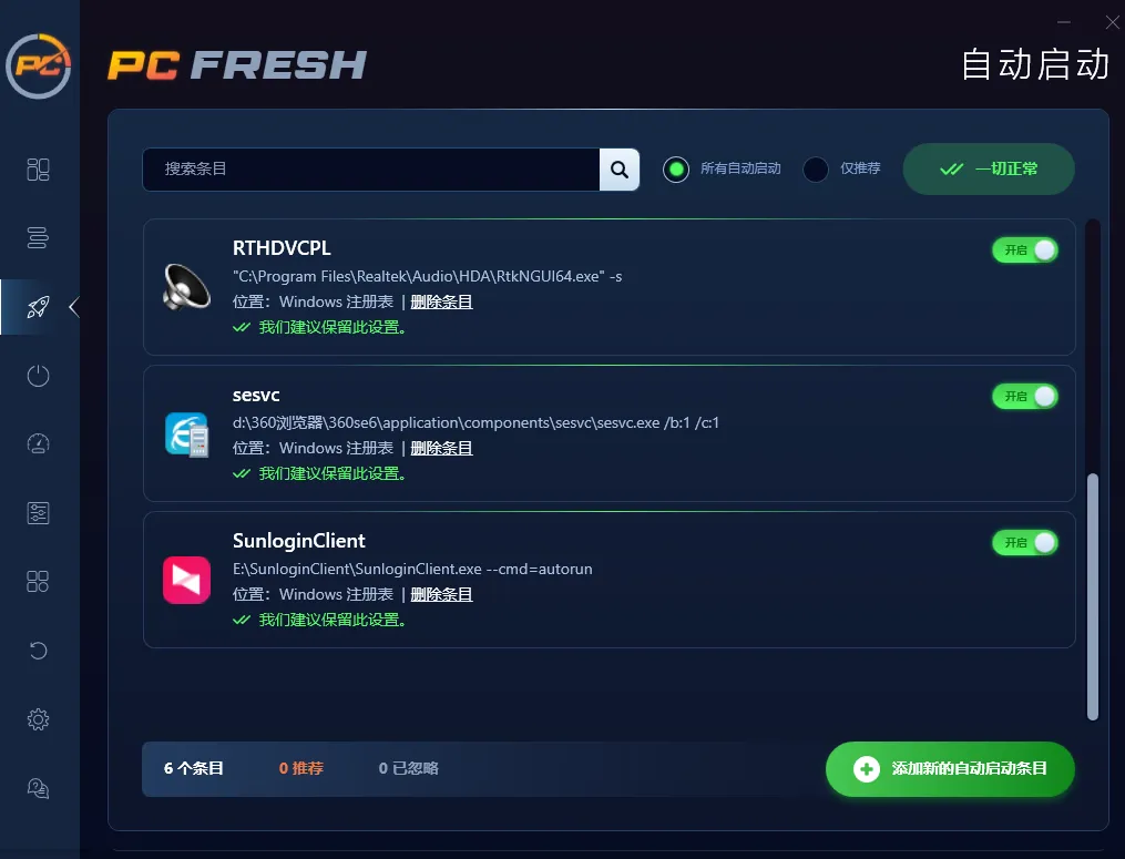 使用体验还是很不错的,简简单单。它的启动项管理也做得很好,会图形化展示所有想偷偷跟着开机的程序,并给你合理的建议,哪些该留,哪些该关,一目了然。即使是电脑小白,也能轻松把开机速度给提上来,不用再去翻那些看不懂的系统设置,优化系统也可以很简单。