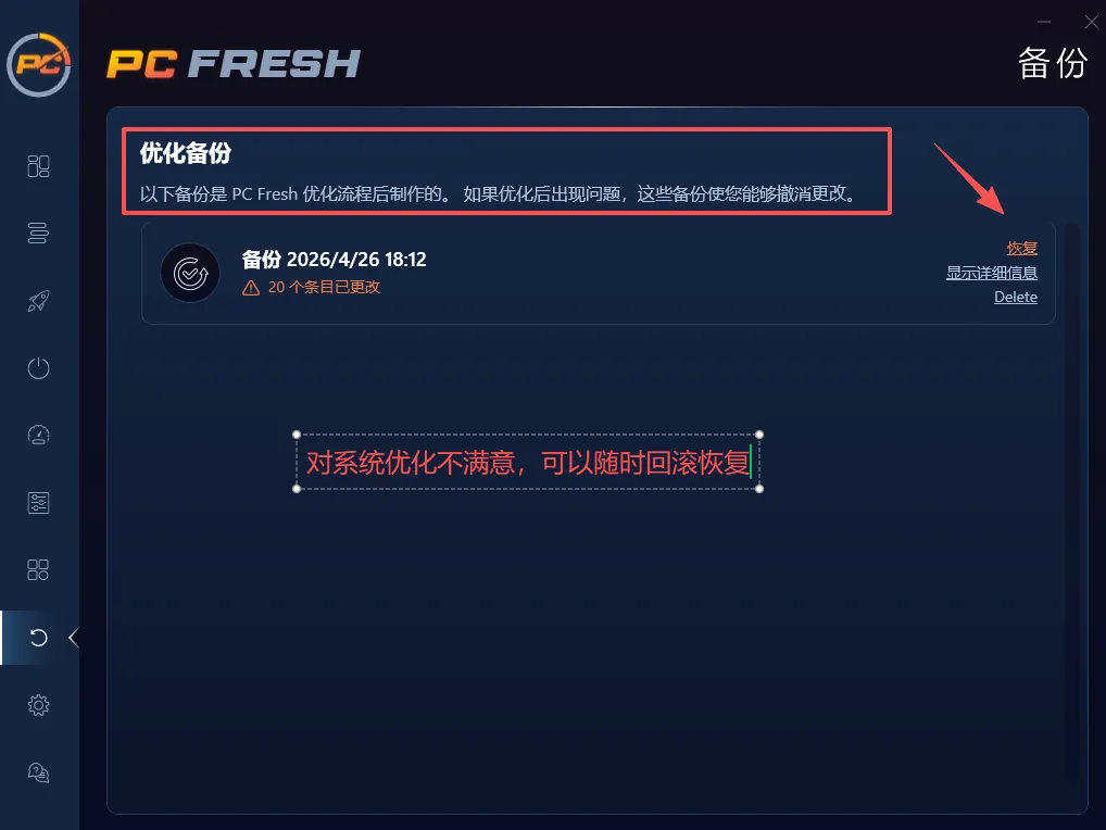 最后,说一下更多工具,这里还是有不少的惊喜,你可以深度的清理一下电脑里藏得很深的垃圾和注册表,顺带连网络带宽也给你优化了,而且最重要的一点,它每次优化前都会自动去创建一个还原点,万一你觉得哪里不对劲,直接点一下就能一键回滚,有了这颗“后悔药”兜底,随便折腾也不怕翻车,特别的棒,大家可以好好体验看看。