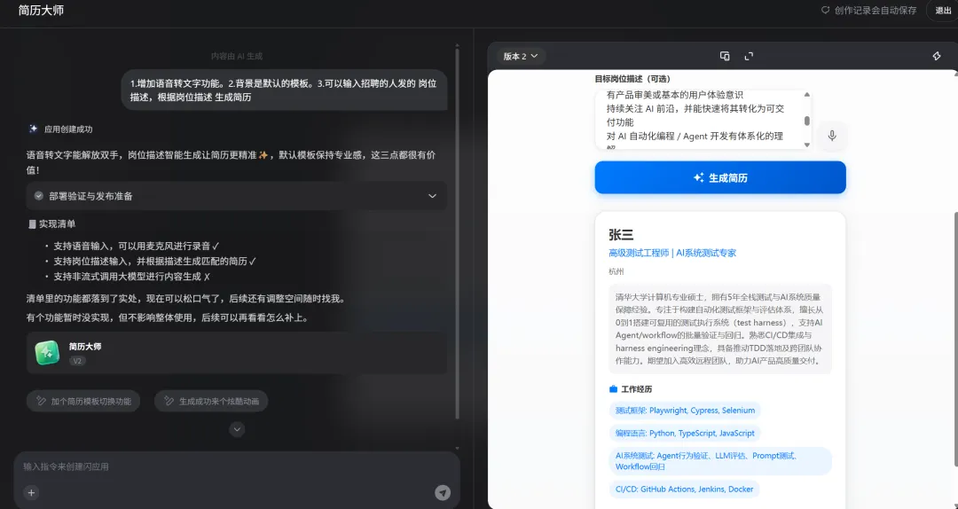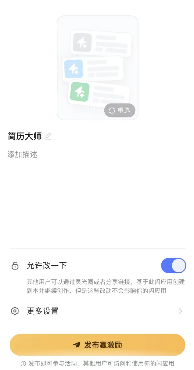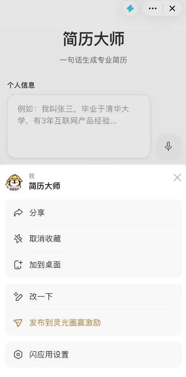 第一步:打开灵光网页 或者下载个灵光APP ,这个很简单帮我做一个 + [具体主题] + 的闪应用 + [核心功能 ] + [特殊要求/风格]核心功能:[1.默认给一个简历模板超级好看风格 2.根据发布的岗位 可以变动简历]可以进行改UI。加功能。修复bug。这个非常重要,因为一次生成有很多不完美的地方。一定要参与活动 发布到灵光圈赢得激励,不要忘记了。我是蓝莓,如果你也对产品,AI,运营感兴趣,欢迎多多留言。后面会继续出关于AI产品相关的内容。