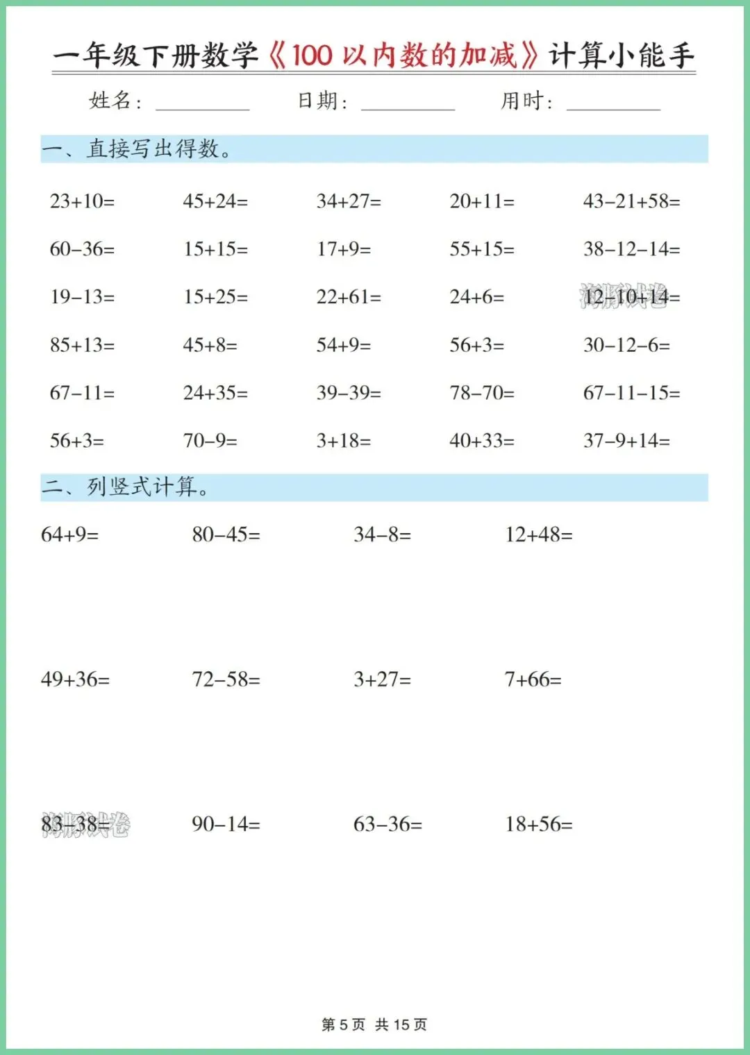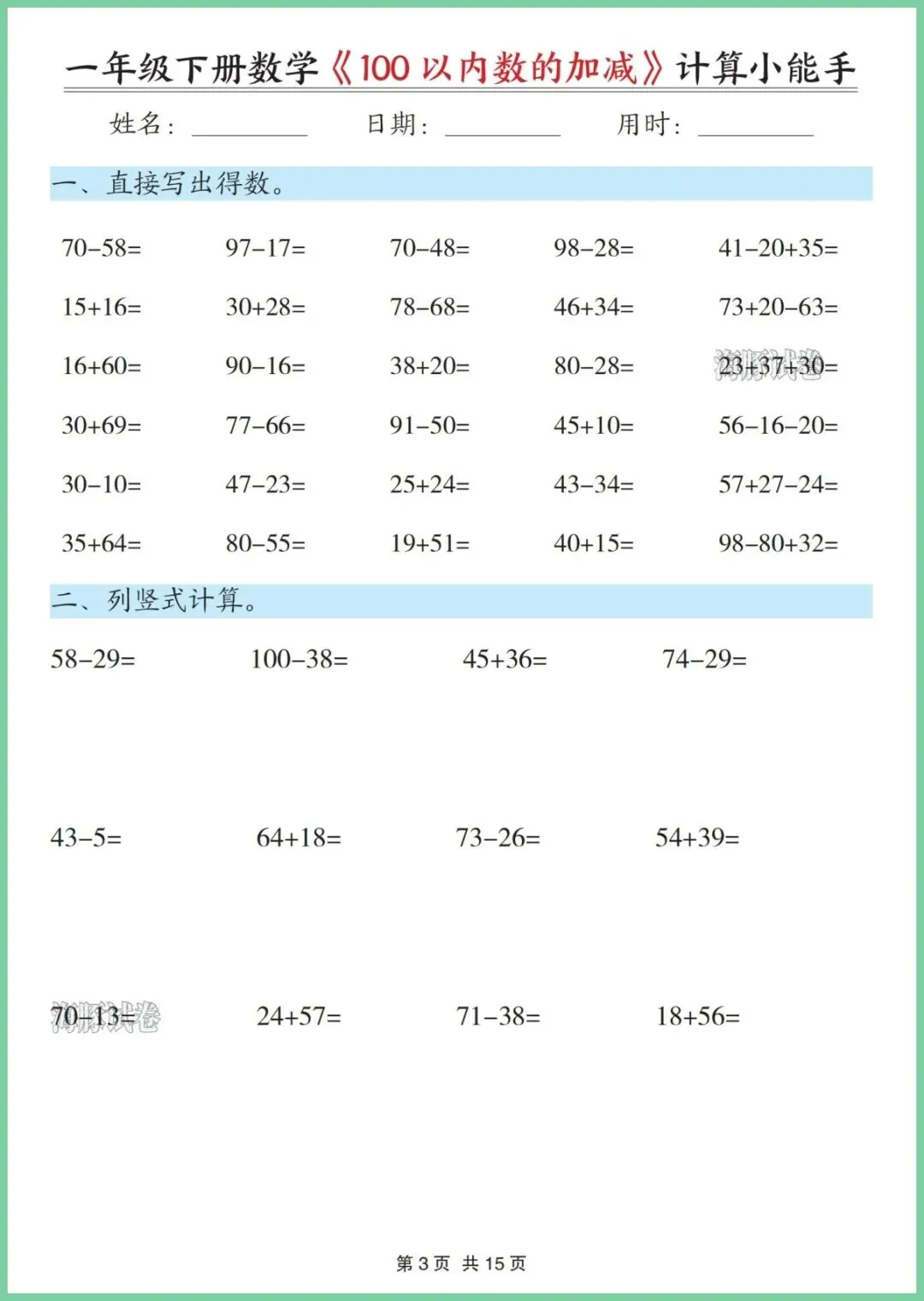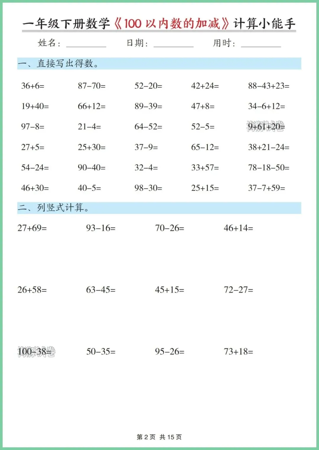 26年春人教版一年级下册数学《100以内数的加减》计算小能手,15页电子版可打印,专为刚学进退位的小豆包设计!每页10~15道趣味算式,口算、竖式、填空、连线、找规律全覆盖,配“错题再练”小格子,帮孩子一次练透进位加、退位减,速度准确率双提升。每天一页,10分钟养成计算小肌肉,期末口算不丢分!家有开学娃的爸妈,赶紧打印出来,让孩子睡前练一练,轻松变“速算小冠军”!
