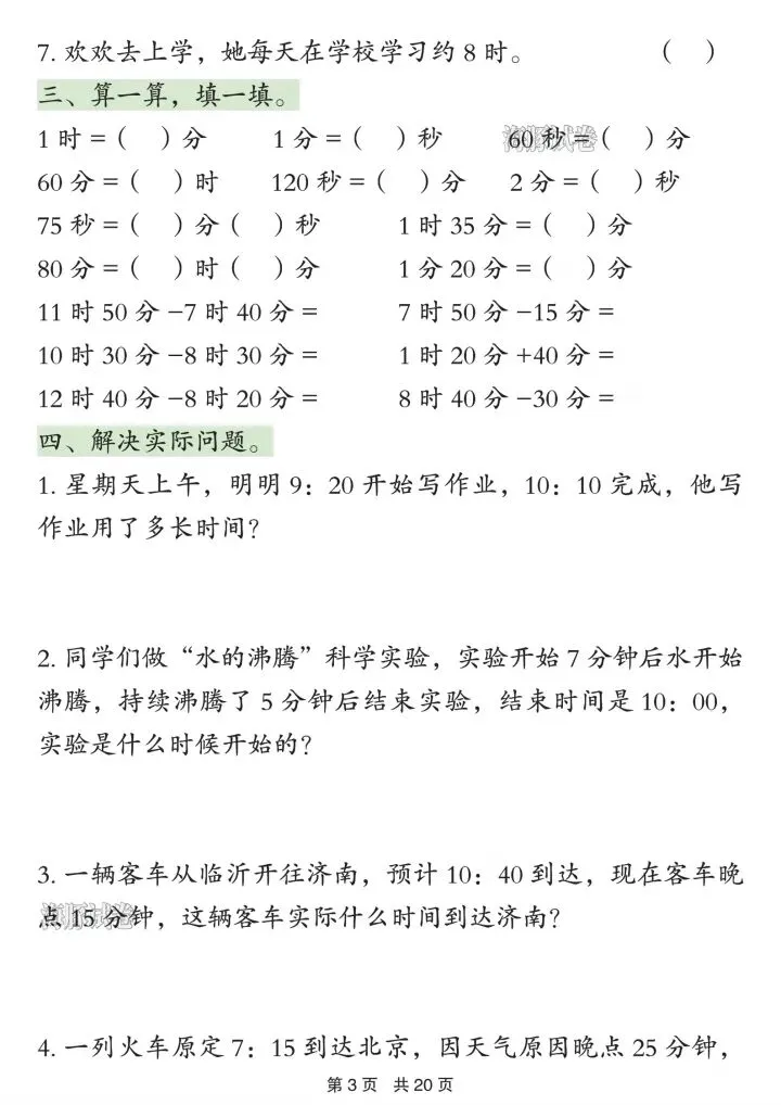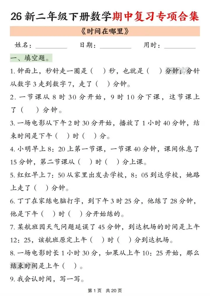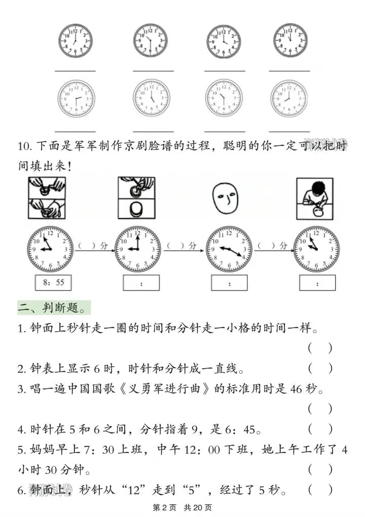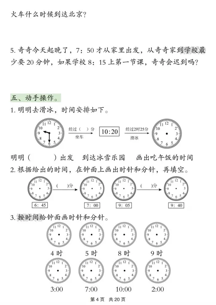1. 时间计算:钟面认读、经过时间、结束时间