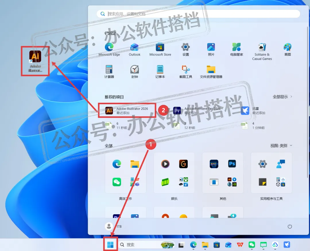 7.需要创建一个Illustrator桌面快捷图标:点击电脑桌面的【开始图标】展开,找到刚刚安装的Adobe Illustrator 2026软件,直接拖动到电脑桌面就能创建完成。