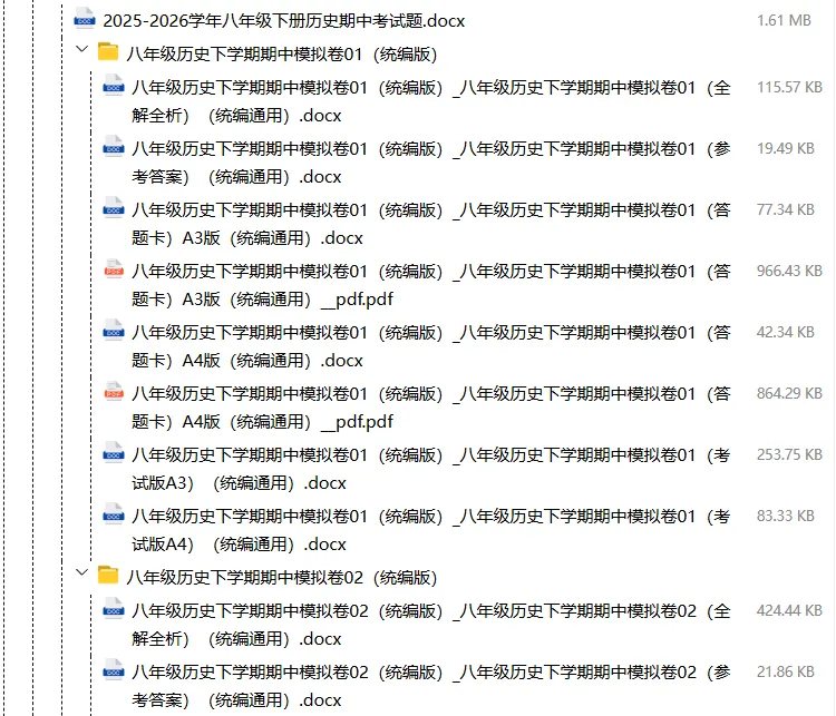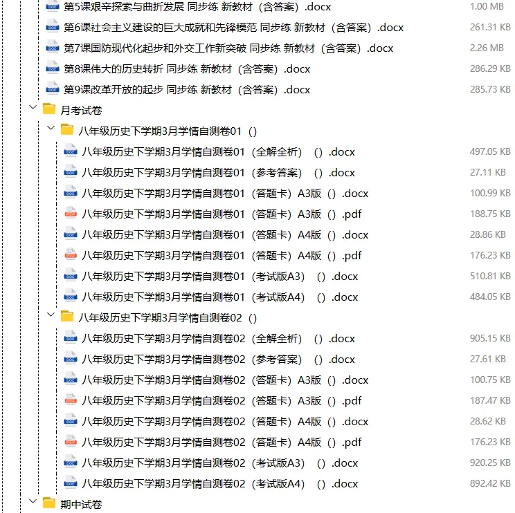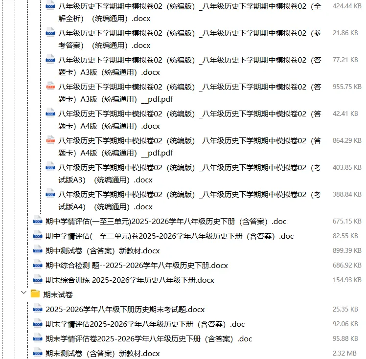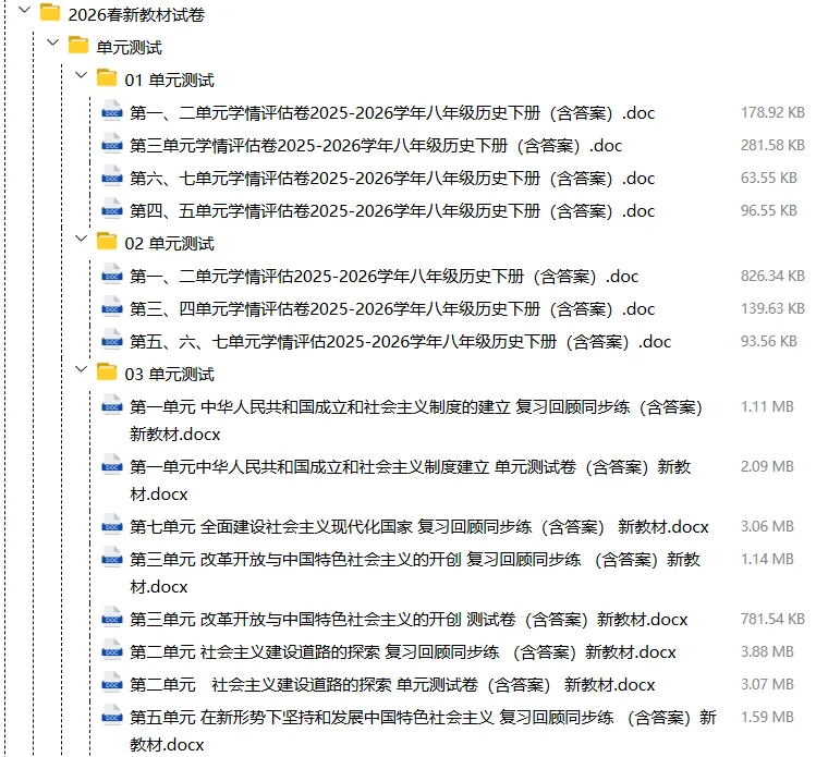 【电子版】2026春人教版初中八年级历史下册 (课时练习+单元测试+月考试卷+期中试卷+期末试卷)全套下载 可编辑打印注意:下拉到文章底部有二维码的地方下载01资料目录下拉到文章底部有二维码的地方下载02资料阅览 版面有限 仅展示部分内容下载方法长按二维轻松下载电脑下载,方便保存复制网址去电脑打开:https://jazpan.com/view/2449711更多资源,关注以下公众号教师·学生图文来自网络,版权归原作者,如有不妥,告知即删点击阅读原文下载1-12年级全部资