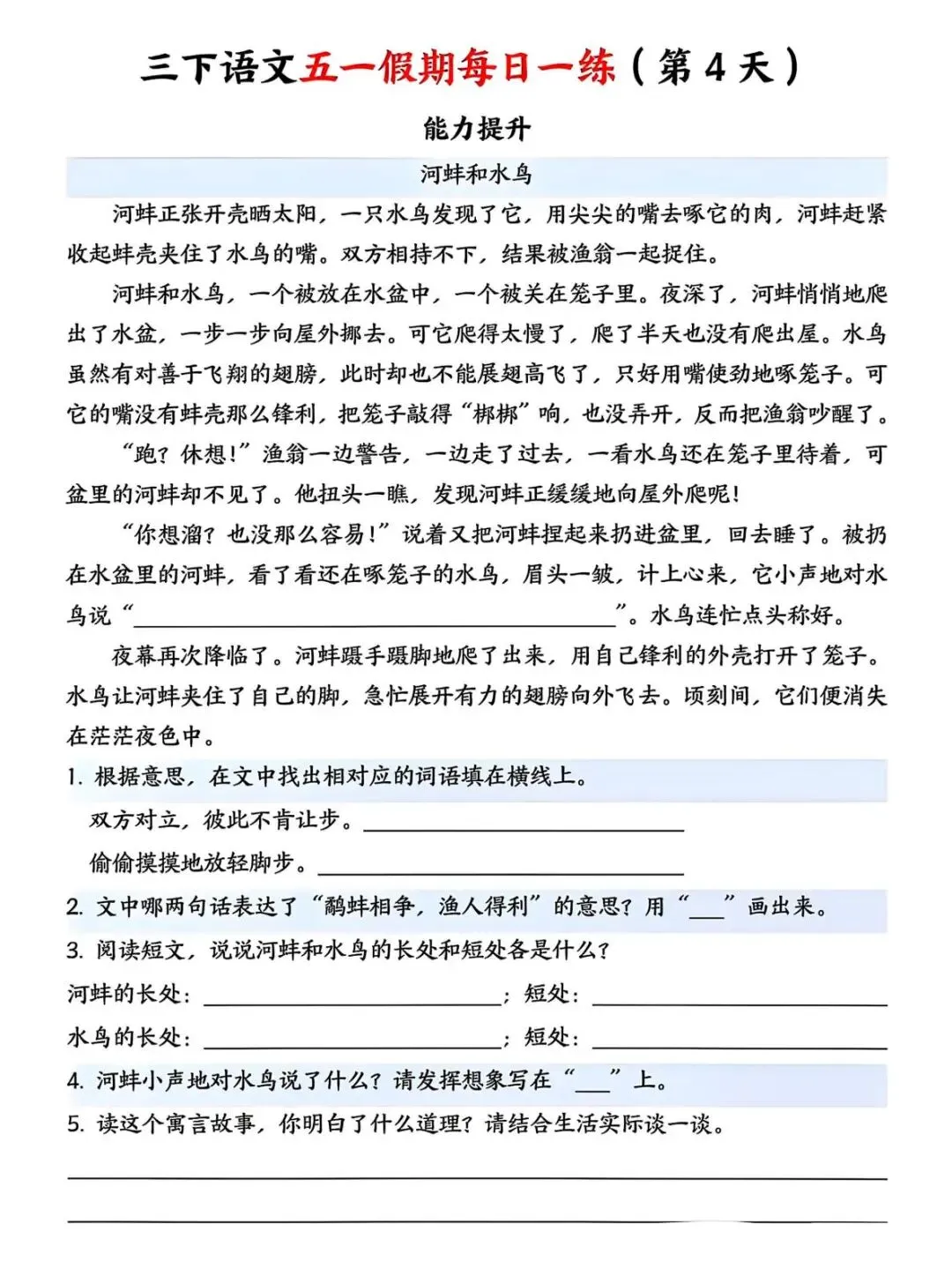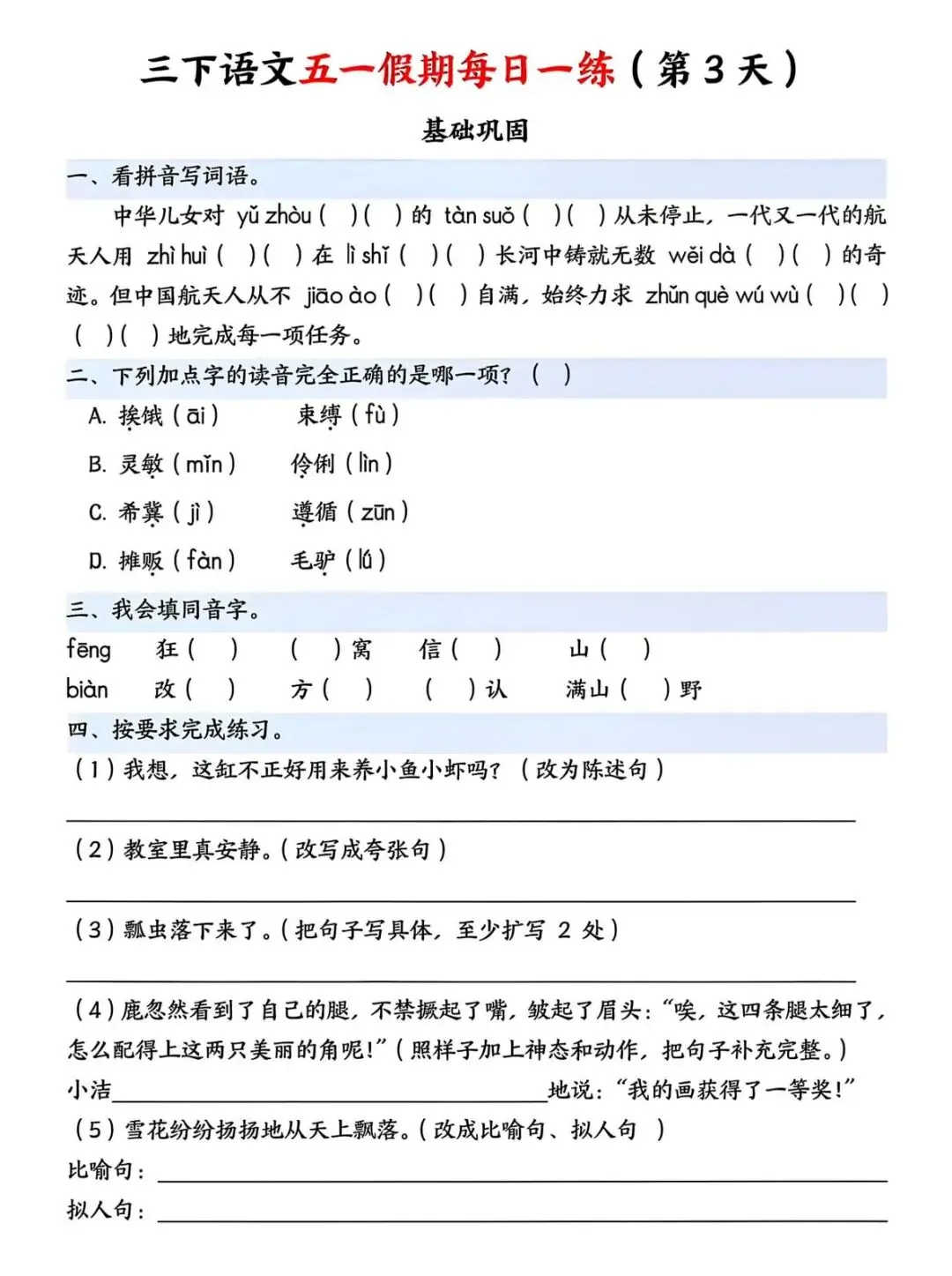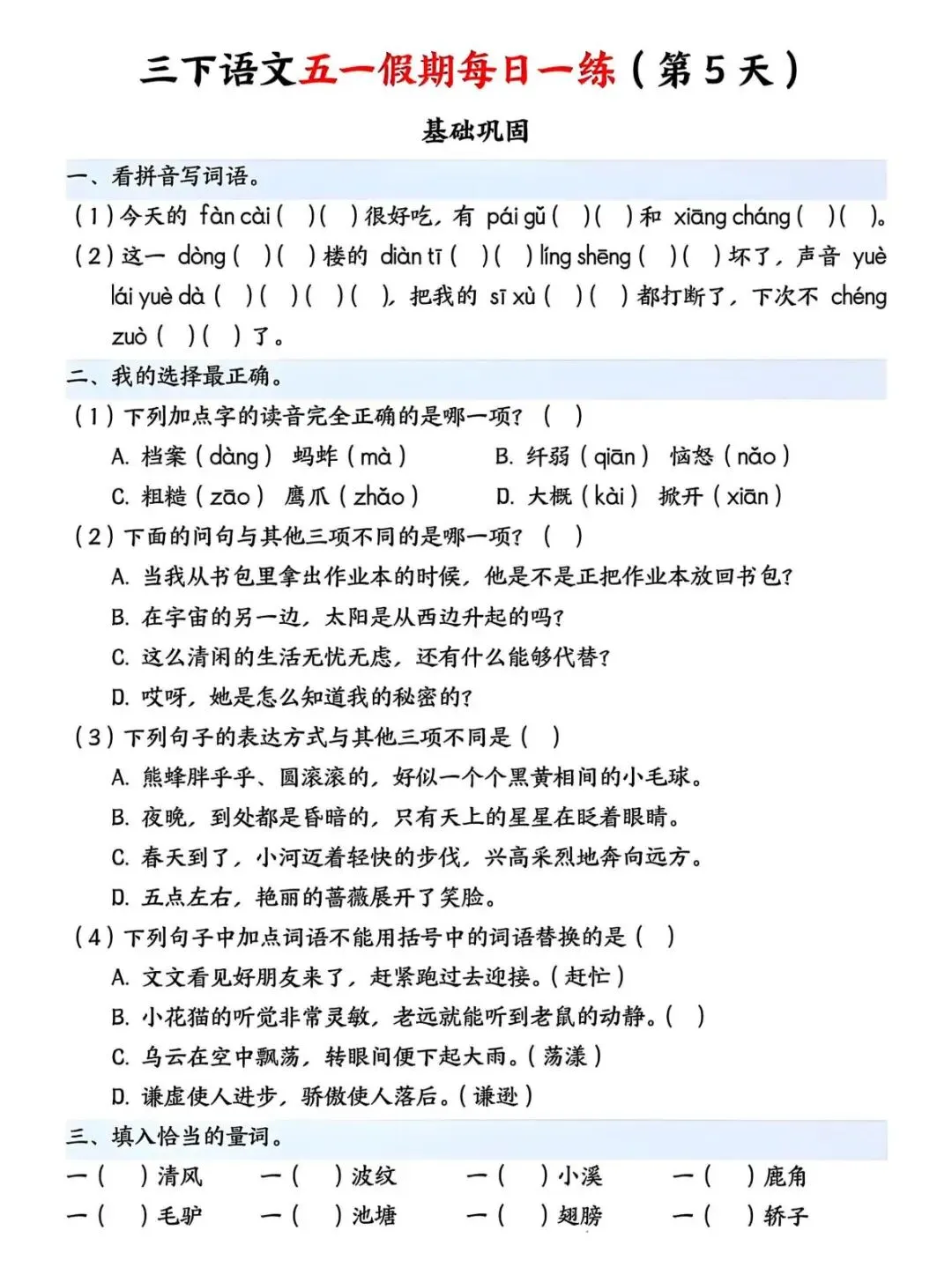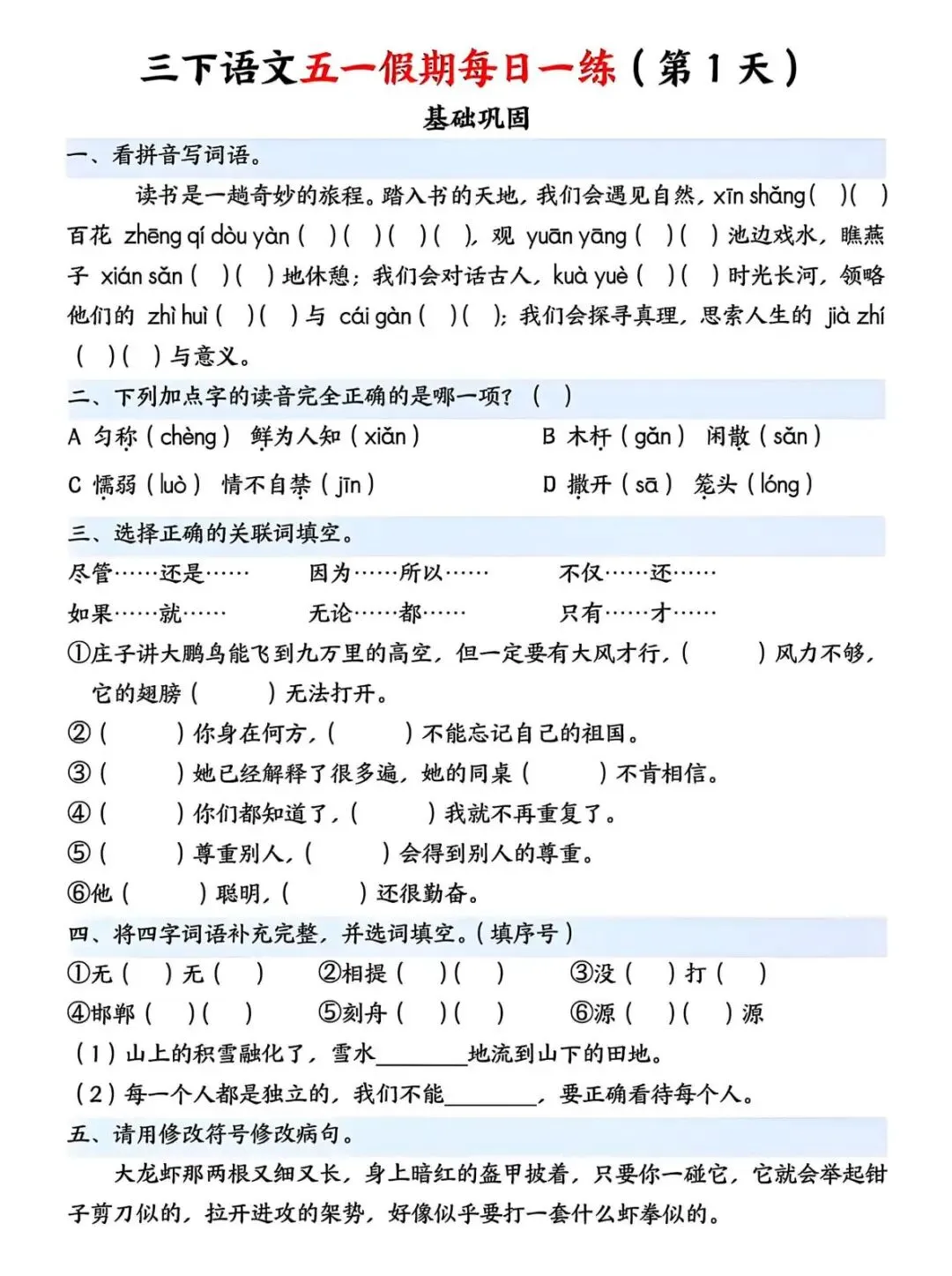 五一假期即将来临,小盆友的学习不能间断,这份五一假期作业包含看拼音写词语、关联词填空、修改病句等内容,需要的家长和老师可以保存让孩子做一做吧!欢迎分享至班级群或家长群,方便分享使用哦!