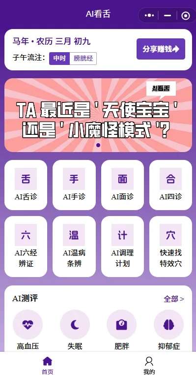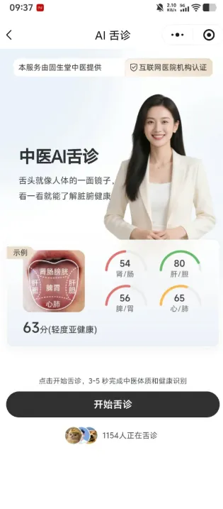 AI虚拟影像诊疗: 利用计算机视觉技术实现AI舌诊与AI面诊,通过拍照自动识别舌质、舌苔、面色等特征,辅助判断用户体质。